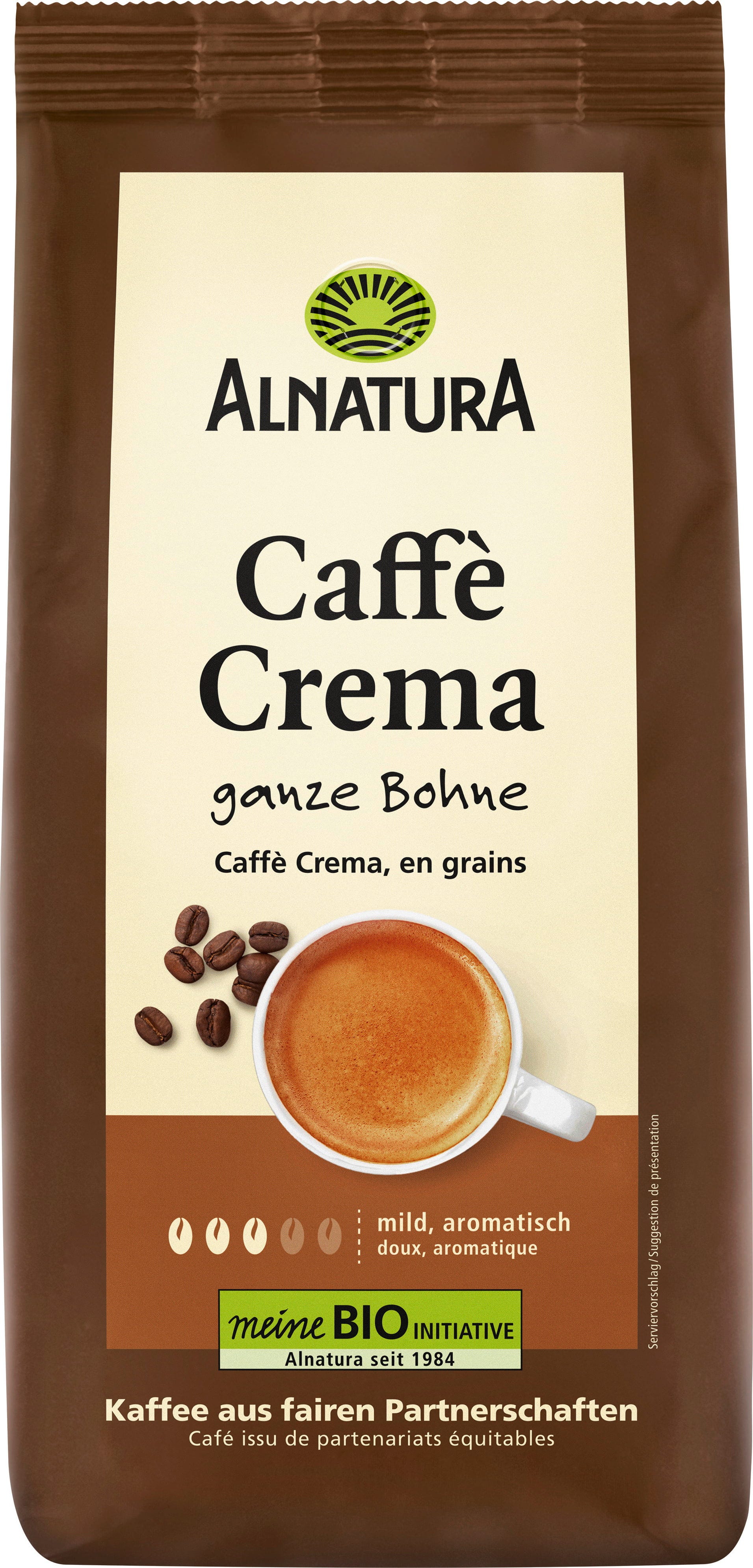Jemně aromatická a zároveň sametově krémová: pro Alnatura Bio Caffé Crema jsou zrna zušlechtěna tradičním dlouhým pražením.