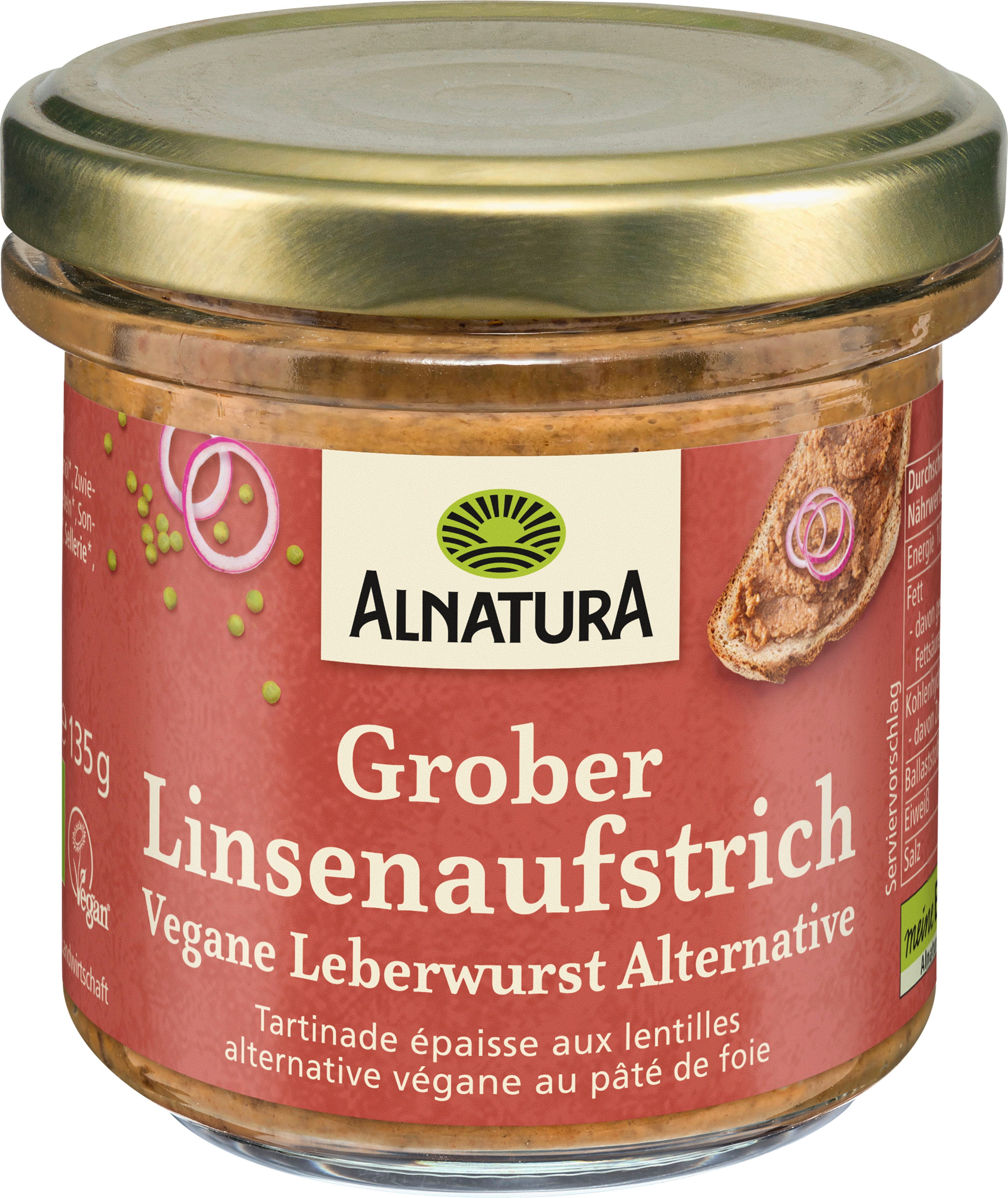 Máte chuť na vydatnou svačinu k chlebu? Základ hrubé Alnatura Bio pomazánky z čočky tvoří zelená čočka a pražená cibulka, jemně doladěné vybraným kořením. Veganská odpověď na klasiku - zcela bez kompromisů. Díky jemně roztíratelné konzistenci si pomazánku skvěle vychutnáte na chlebu.