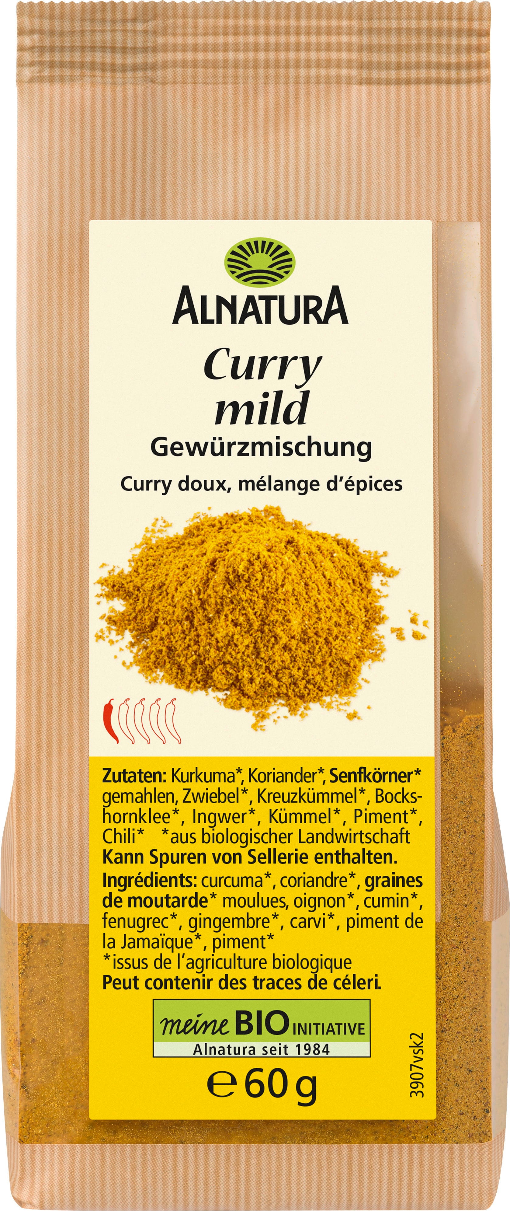 Kořenicí směs Alnatura Bio Curry se skládá především z kurkumy a koriandru, doplněných o pískavici, římský kmín, hořčičná semínka a cibuli. Spojuje v sobě chutě indické kuchyně a skvěle ladí s rybami, masem, zeleninou i rýžovými pokrmy.