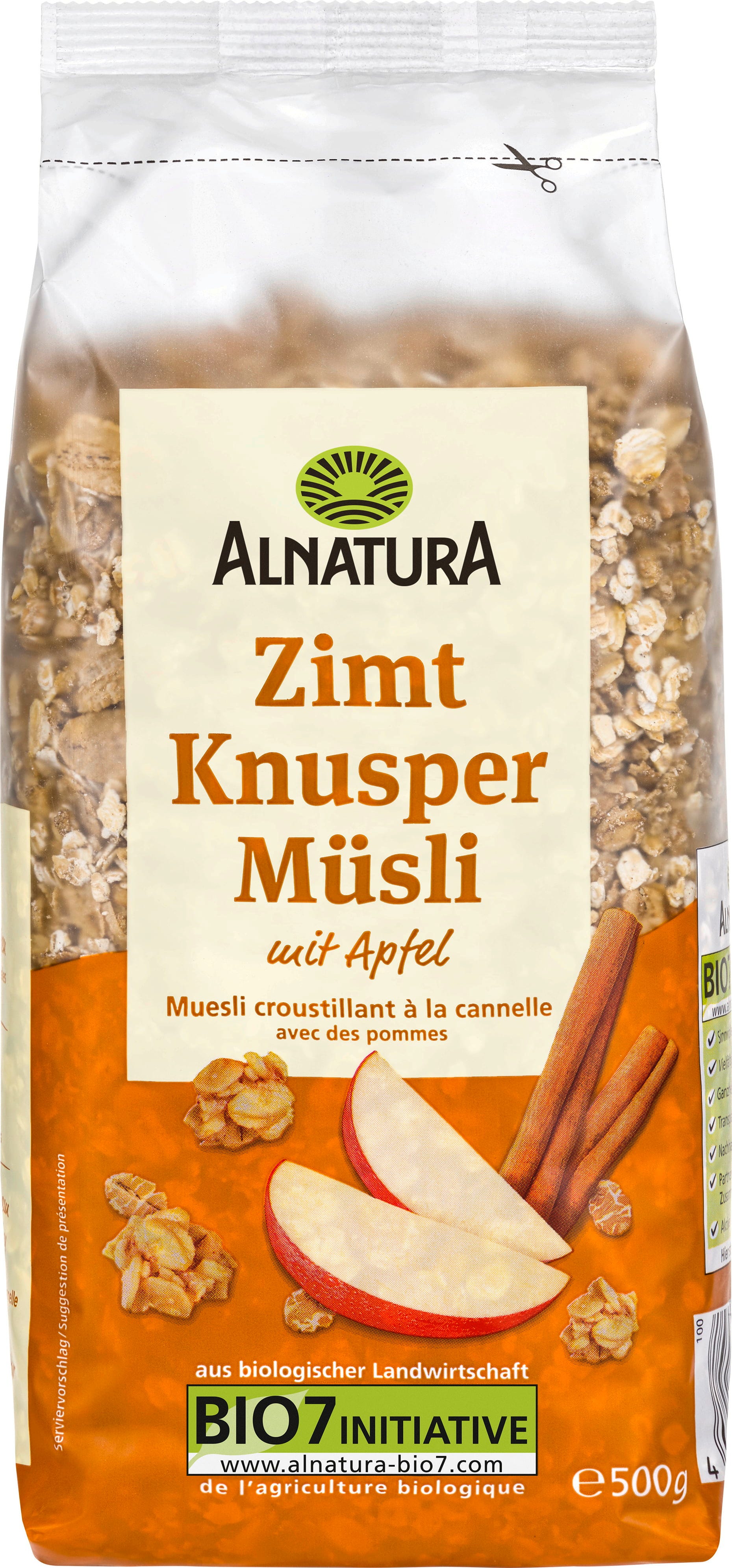 Souhra skořicového crunchy a aromatických sušených kousků jablek. Báseň na snídaňovém stole. Chutná nejen s mlékem a jogurtem, ale i s jejich rostlinnými alternativami, stejně jako s čerstvým ovocem a ořechy. Veganské Alnatura Bio skořicové křupavé müsli je bohaté na vlákninu.