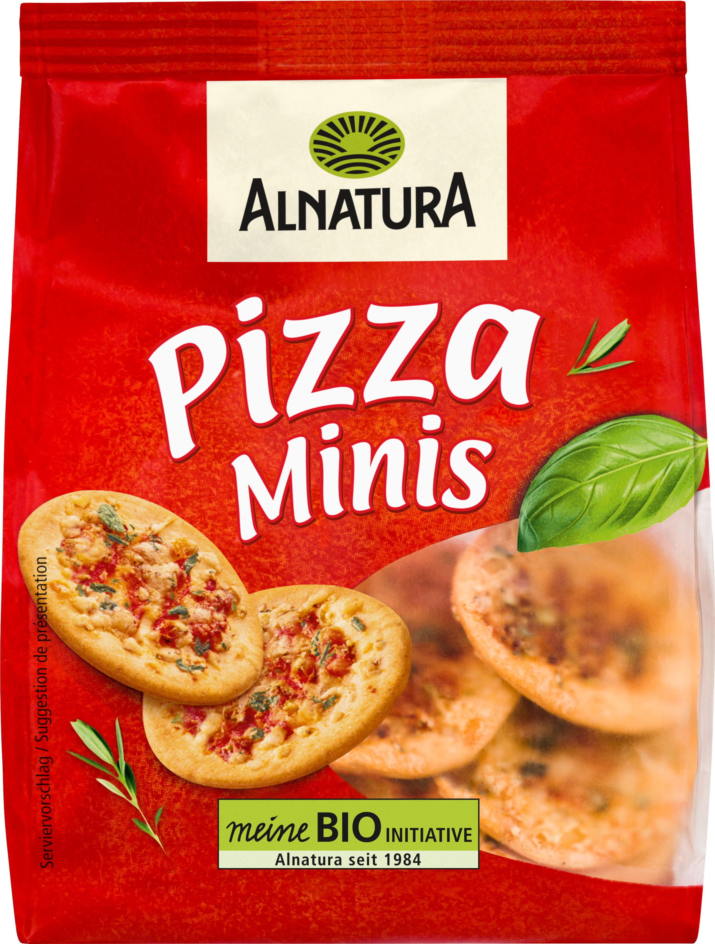 Milovníci pizzy, pozor: Křupavé Alnatura Bio Pizza Minis jsou jemně dochucené ovocnou rajčatovou omáčkou, aromatickým sýrem, bazalkou, oreganem a tymiánem. Perfektní snack domů i na cesty mezi jídly.