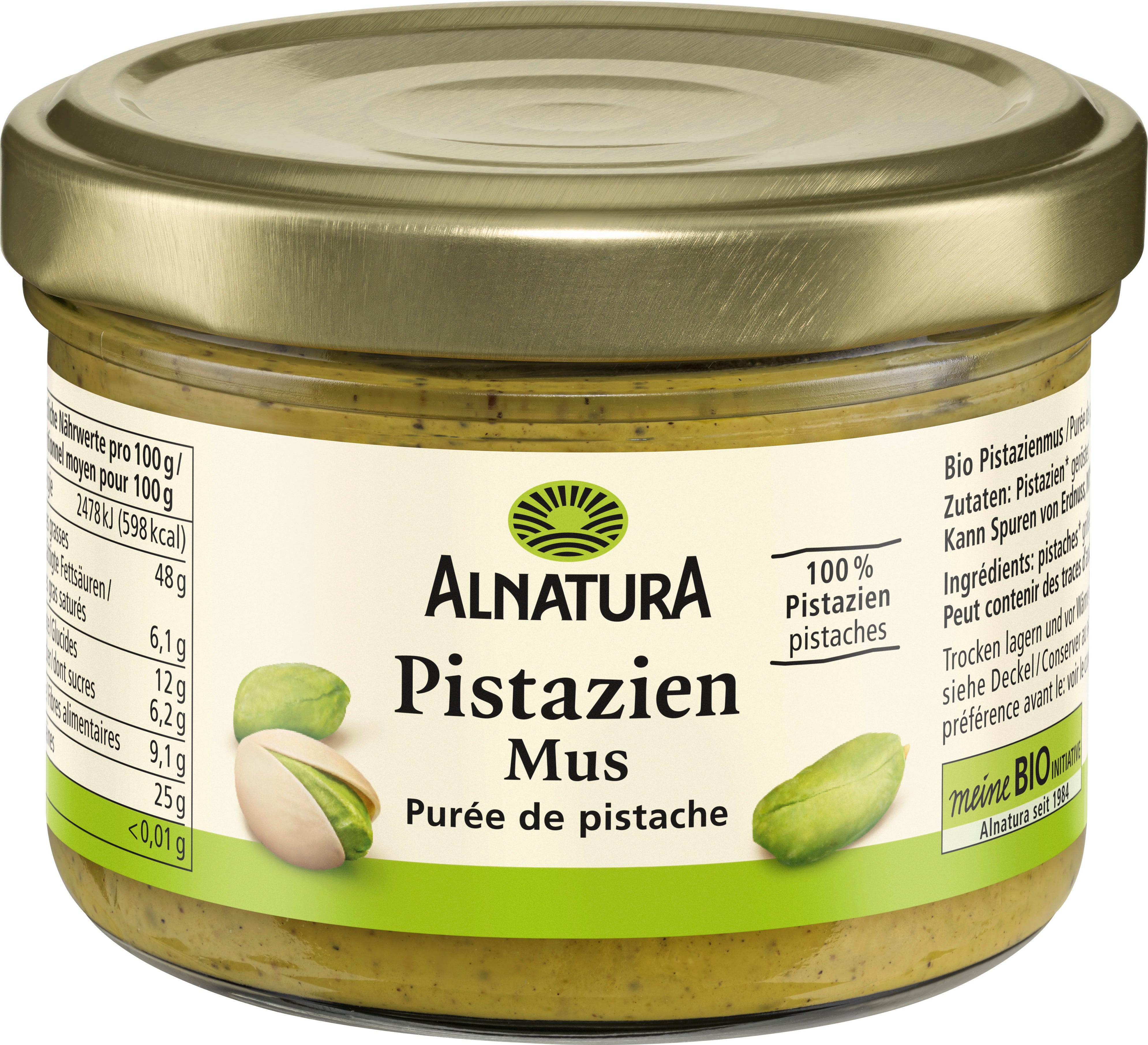Veganský pistáciový sen: Alnatura Bio pistáciové máslo je vyrobeno ze 100 % pistácií. Chuť je jemně nasládlá, konzistence nebesky krémová. Sen na snídaňovém stole - ať už v porridge, bowl nebo jednoduše na chlebu.