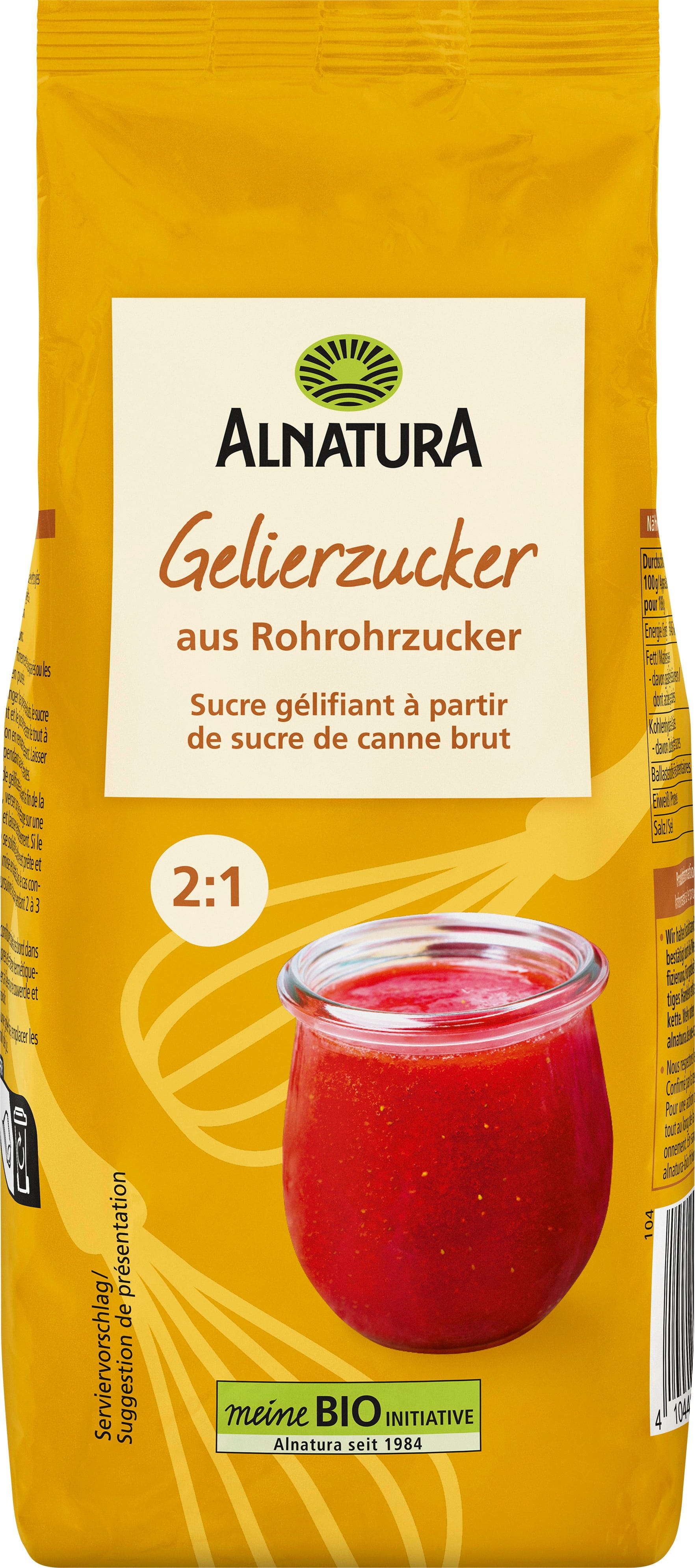 Jemná sladkost Alnatura Bio želírovacího cukru je ideální pro domácí ovocné pomazánky, marmelády, želé a další dobroty a zajistí správnou konzistenci. Základ tvoří třtinový cukr a pektin. Jedno balení vystačí na 1 kg ovoce nebo 750 ml šťávy a na obalu najdete podrobný návod.
