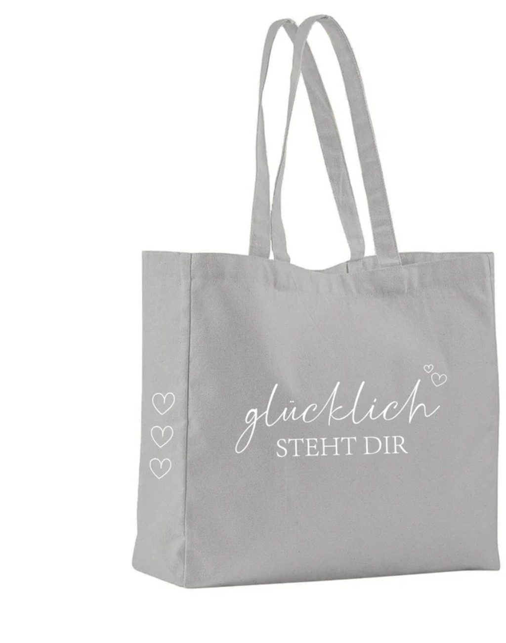 Tato pevná bavlněná taška s dlouhými uchy a nápisem "Glücklich steht dir" („Štěstí ti sluší“) je stylovým a praktickým společníkem pro každý den, nákupy i další příležitosti. S přehledem pojme vše, co právě potřebujete. Skvěle se hodí i jako dárek pro někoho blízkého.