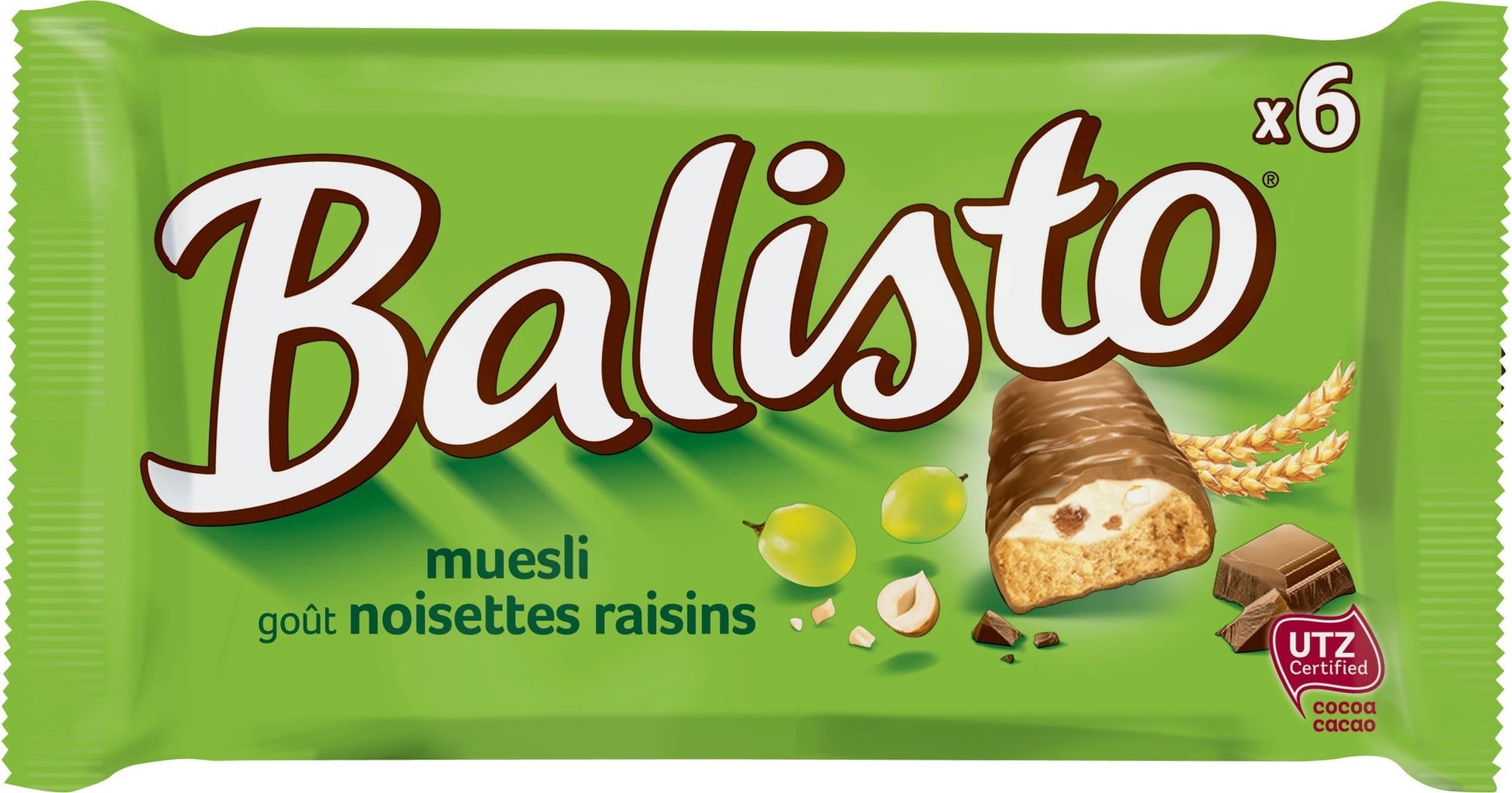 V tomto lahodném produktu Balisto se spojují křupavé sušenky a jemný krém s příchutí lískových oříšků a rozinek - lahodná sladká svačinka mezi jídly, zalitá jemnou čokoládou.