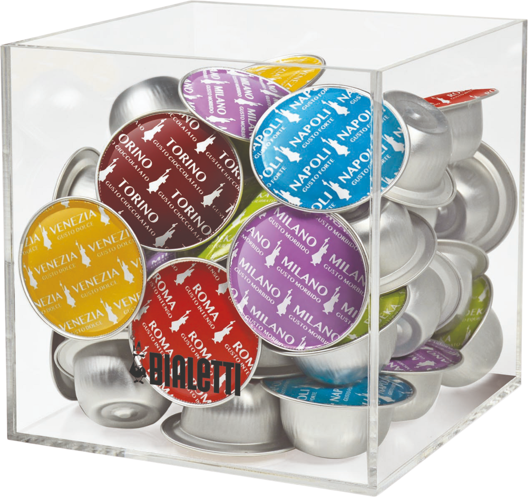 Tato průhledná plexisklová kostka s logem Bialetti je elegantním řešením pro uskladnění až 45 kapslí Bialetti. Díky nadčasovému designu se hodí do každého interiéru a zajistí, že budete mít své oblíbené kávové kapsle vždy po ruce.