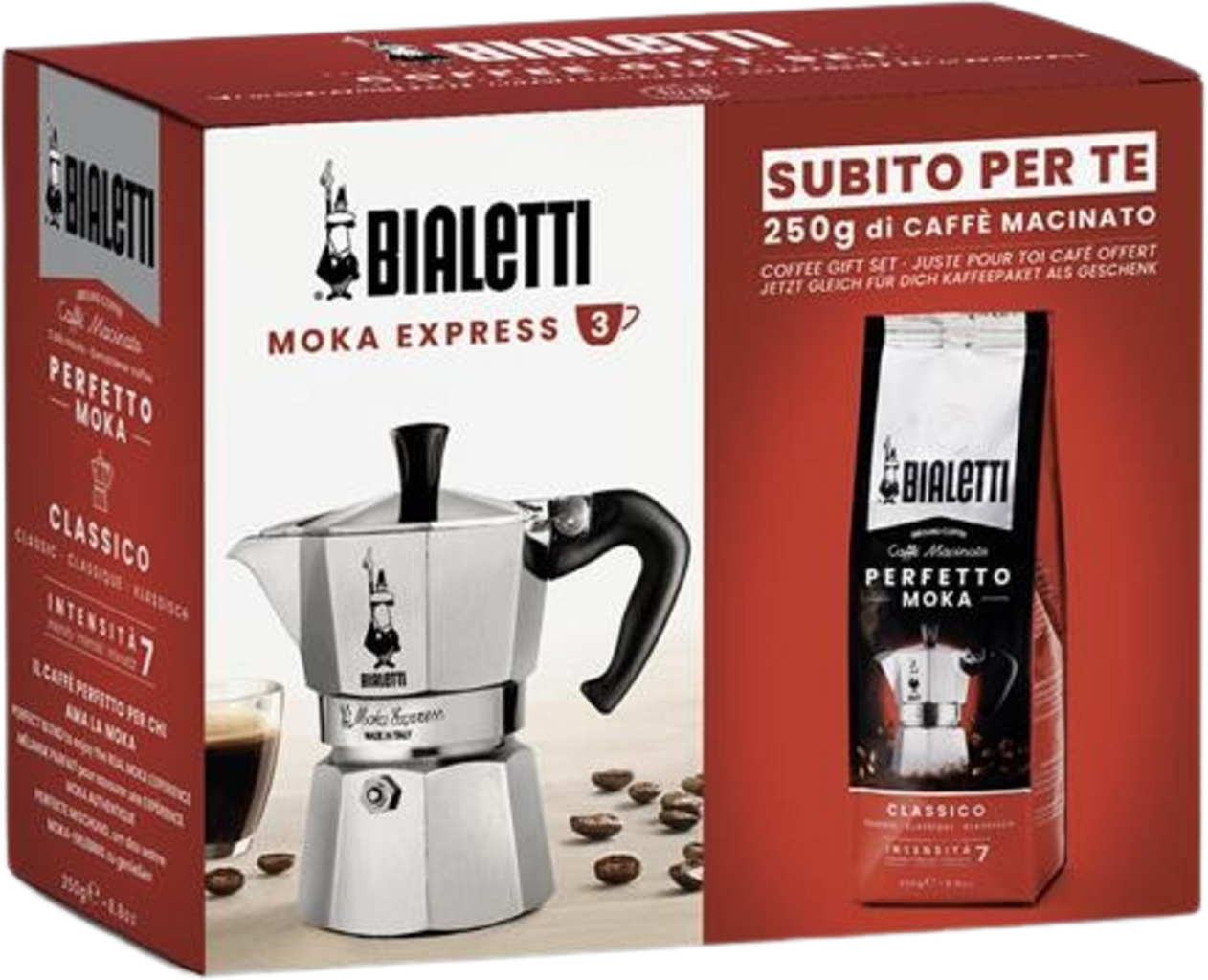 Tato dárková sada spojuje eleganci a výkon v osvědčené kvalitě značky Bialetti. Obsahuje moka konvičku Moka Express na tři šálky a balení kávy Perfetto Moka. Konvička je vyrobena z kvalitního hliníku, má ergonomickou protiskluzovou rukojeť a zaujme harmonickými a jemně zaoblenými liniemi.