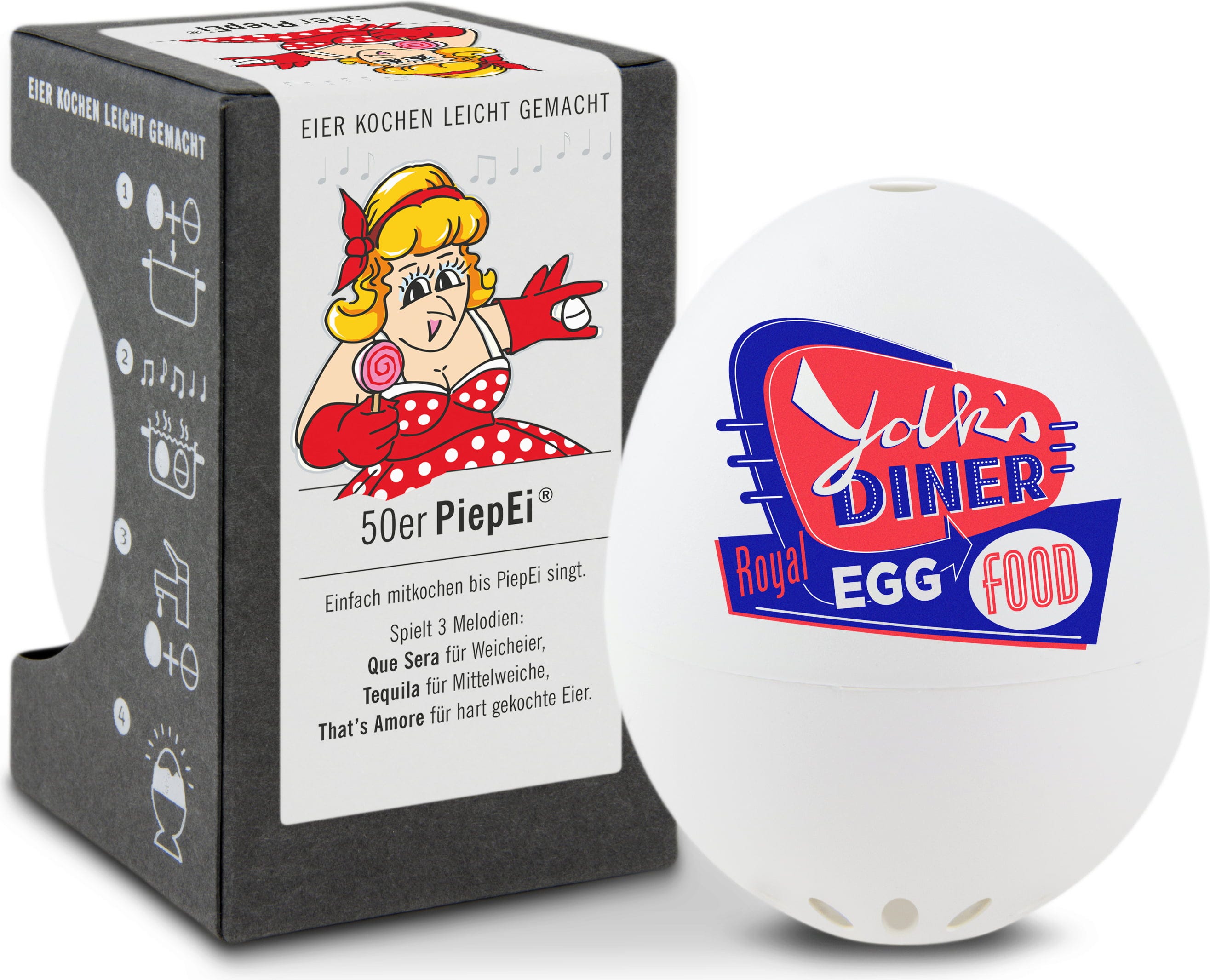 Stačí PiepEi 50. léta skladovat spolu s vejci, vařit je společně a počkat, až zazní melodie odpovídající požadovanému stupni uvaření. Nezáleží na tom, s jakou teplotou vody začínáte, jakou mají vejce velikost ani v jaké nadmořské výšce vaříte.