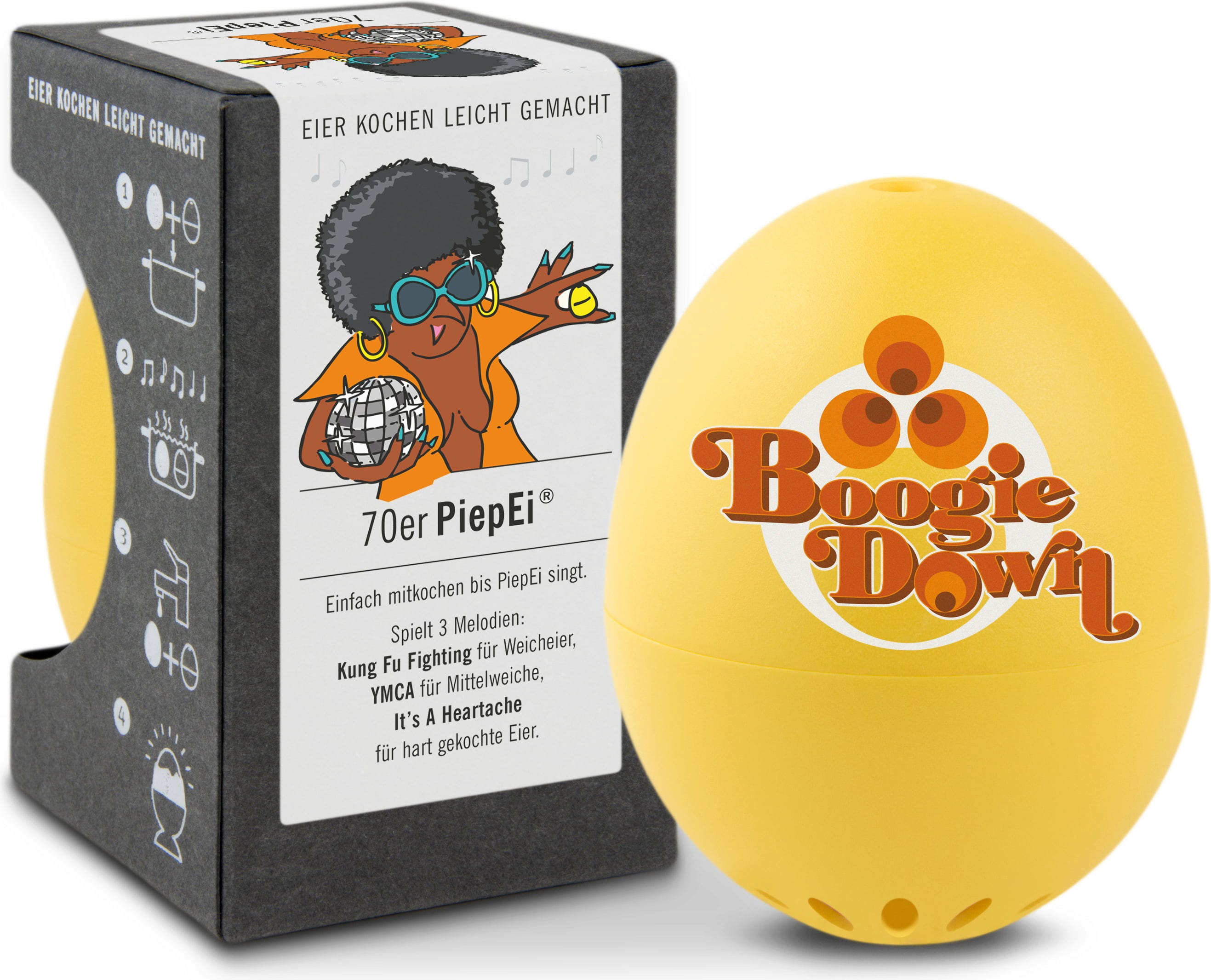 Stačí PiepEi 70. léta skladovat spolu s vejci, vařit je společně a počkat, až zazní melodie odpovídající požadovanému stupni uvaření. Nezáleží na tom, s jakou teplotou vody začínáte, jakou mají vejce velikost ani v jaké nadmořské výšce vaříte.