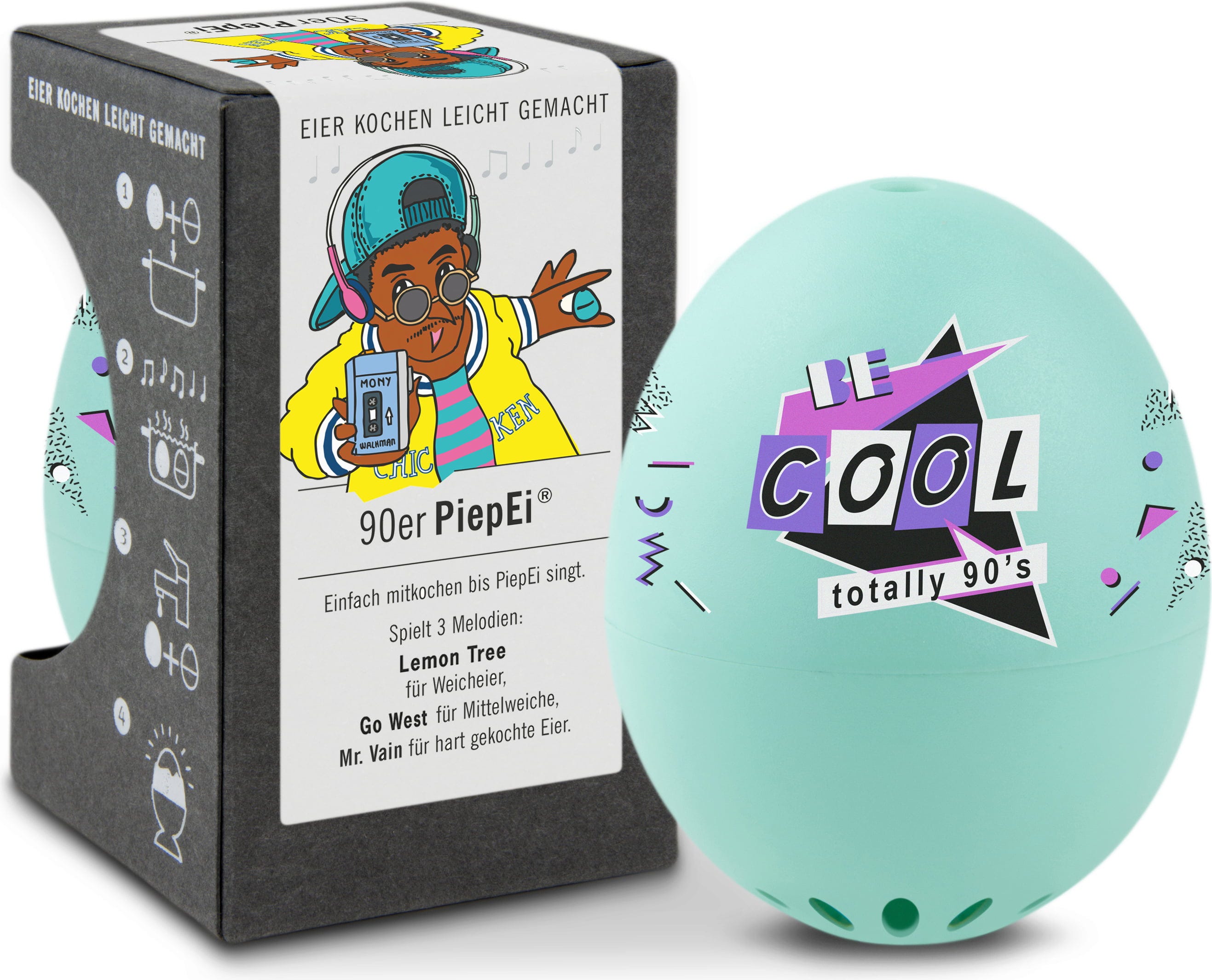 Stačí PiepEi 90. léta skladovat spolu s vejci, vařit je společně a počkat, až zazní melodie odpovídající požadovanému stupni uvaření. Nezáleží na tom, s jakou teplotou vody začínáte, jakou mají vejce velikost ani v jaké nadmořské výšce vaříte.