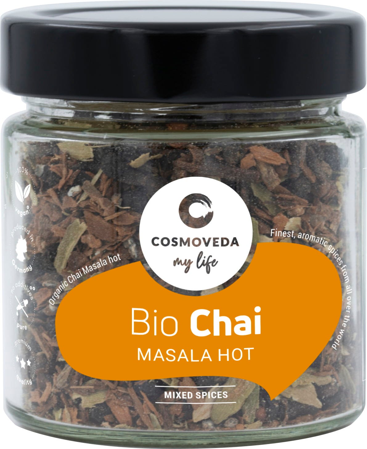COSMOVEDA Chai Masala obsahuje vzácné indické koření, jako jsou kardamom, zázvor, skořice a hřebíček, a používá se k přípravě lahodného indického mléčného čaje Chai.