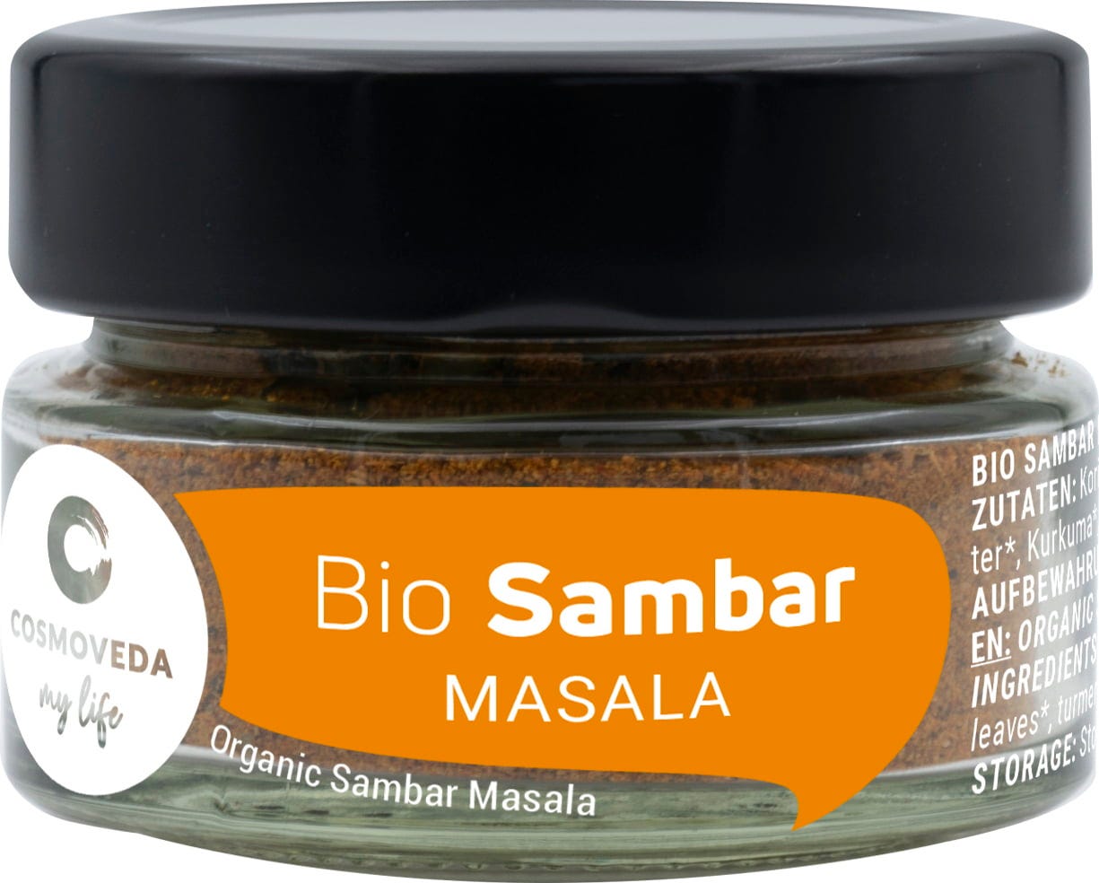 COSMOVEDA Bio Sambar Masala, speciálně namíchaná ajurvédská směs vynikajícího koření, která Vám pomůže vytvořit lahodný Sambar. Masala jednoduše přidejte na začátku vaření nebo ji předtím krátce opečte na ghí nebo kokosovém oleji.