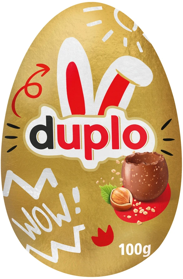 S čokoládovým velikonočním vajíčkem duplo si vychutnáte oblíbenou kombinaci jemné mléčné čokolády a lahodné lískovo-oříškové chuti v obzvlášť slavnostní podobě. Ať už jako lesklý doplněk Vaší velikonoční dekorace, nebo jako sladké překvapení pro Vaše blízké, toto zlaté vajíčko s rošťáckými zaječími oušky vykouzlí dobrou náladu kdekoliv!