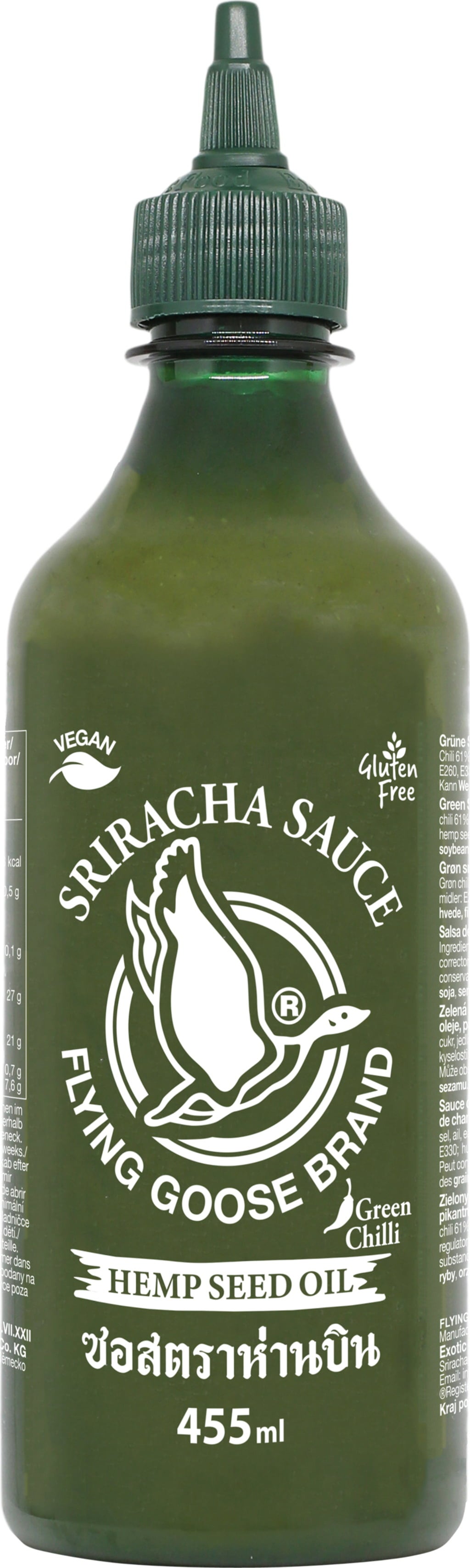 FLYING GOOSE Sriracha zelená chilli omáčka s konopným olejem, 455 ml