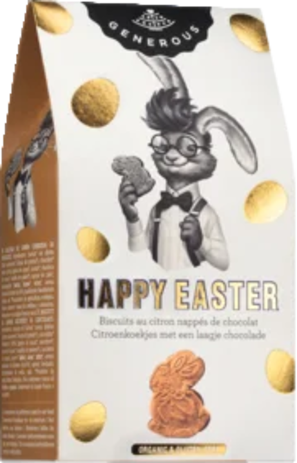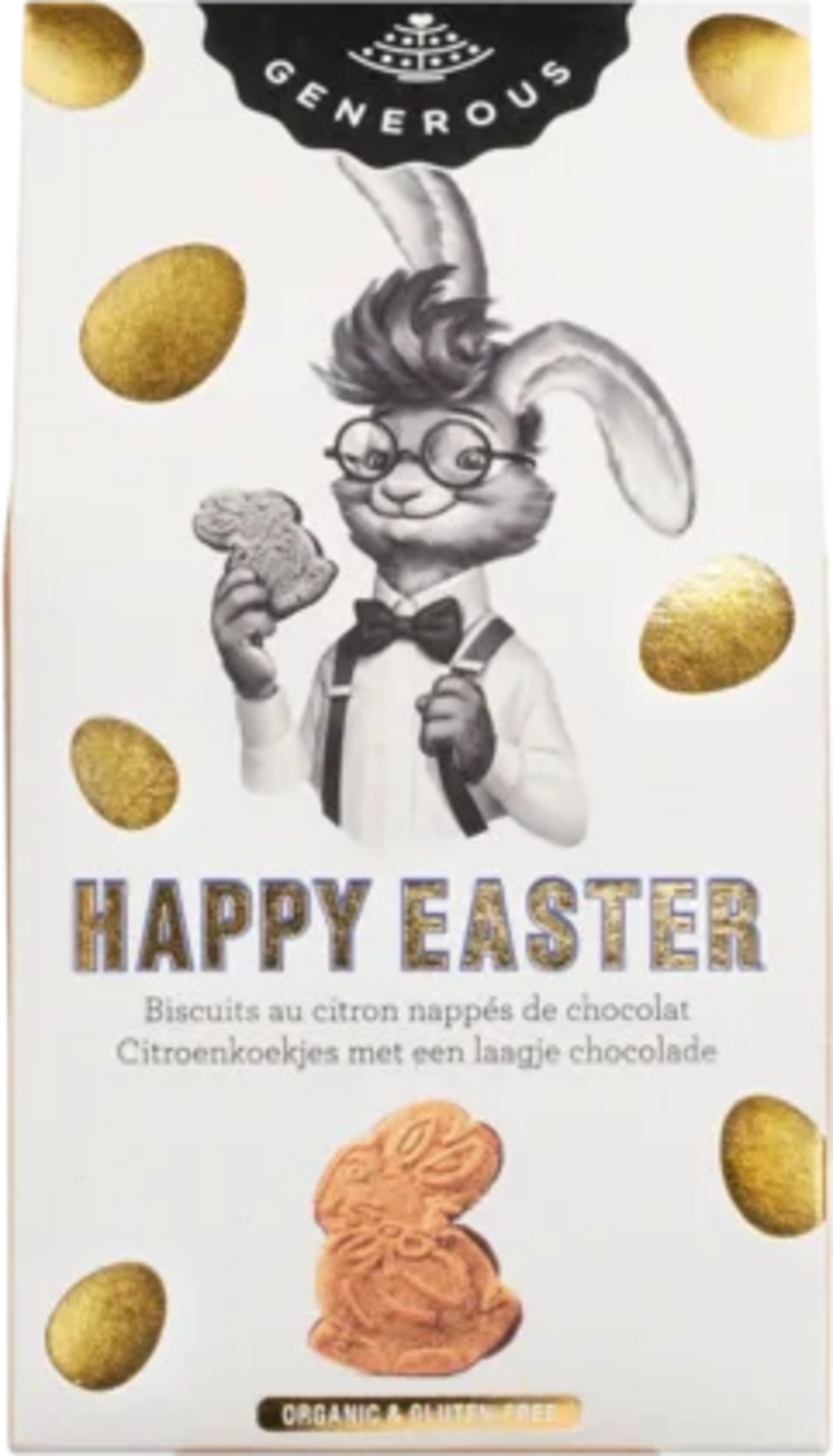 Oslavte Velikonoce s půvabnými máslovými sušenkami „Happy Easter“ od belgické manufaktury Generous. Prakticky tvarovaní zajíčci se pečou z kvalitní bezlepkové moučné směsi s pohankovou moukou a bramborovým škrobem a díky přírodnímu citronovému aroma získávají příjemně svěží tón. Pro dokonalý chuťový zážitek je spodní strana každé sušenky potažena vrstvou 30% hořké čokolády, která tvoří harmonický kontrast s jemnou máslovou notou.