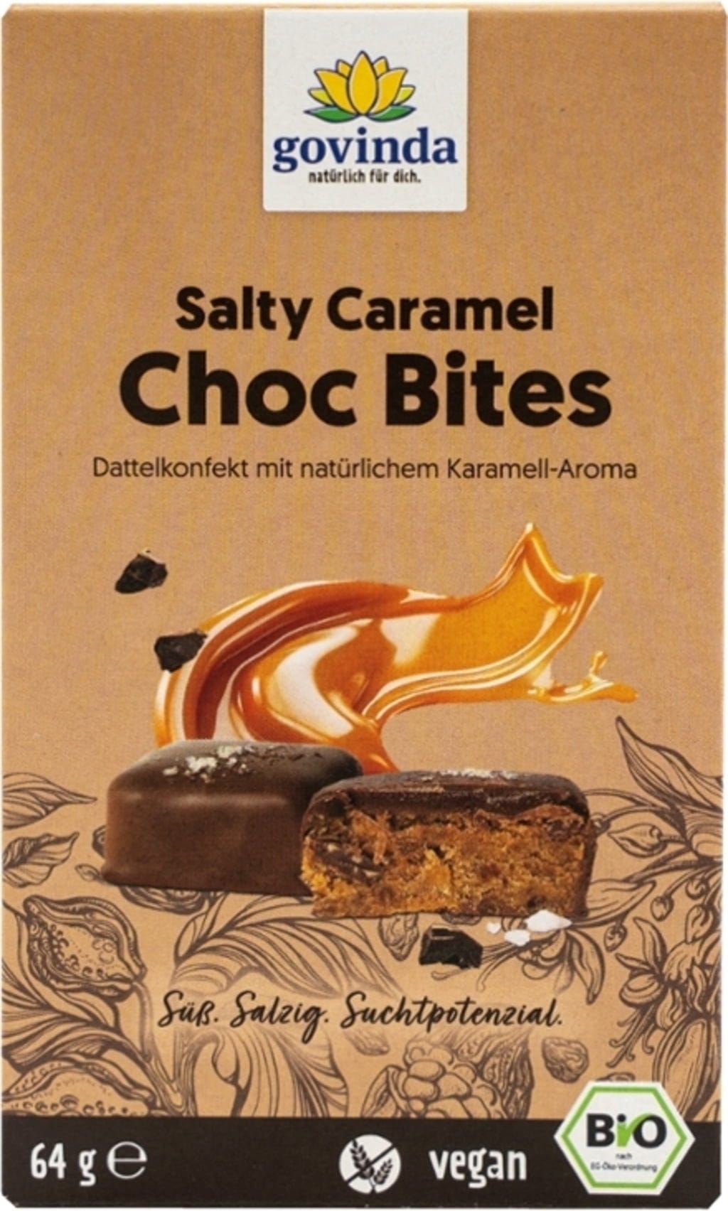 Salty Caramel Choc Bites od značky Govinda jsou exkluzivní cukrovinkou na bázi datlí a mleté cizrny. Obalené v kvalitní čokoládové couverture s minimálně 70% podílem kakaa spojují sladkost agávového sirupu s jemnou špetkou mořské soli a přirozeným karamelovým aroma. Tato veganská receptura z kontrolovaného ekologického zemědělství nabízí výjimečný chuťový zážitek pro vědomé gurmány. Praktické balení je ideální na cesty nebo jako malá pozornost.