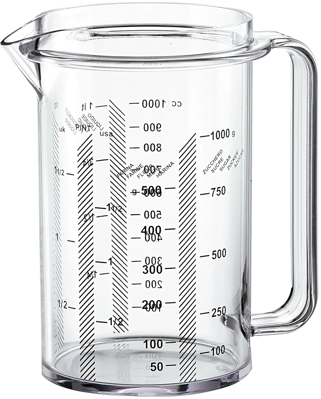 Džbánek má chytrou odměrku, která Vám ukazuje nejen objem tekutin v různých mezinárodních jednotkách, ale také hmotnost mouky a cukru. Takto máte všechny důležité míry pro Vaše pečení a vaření shrnuté v jedné praktické nádobě.