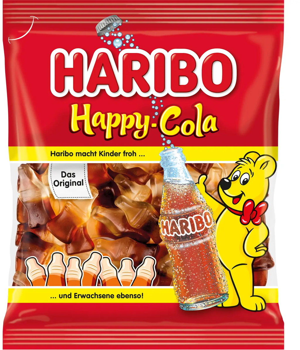 Oblíbené zejména u dětí, ale i u dospělých: měkké ovocné gumové bonbony Happy Cola v retro designu lahve coly! Typická colová chuť, ale bez kofeinu, takže po nich budete chtít sáhnout častěji.
