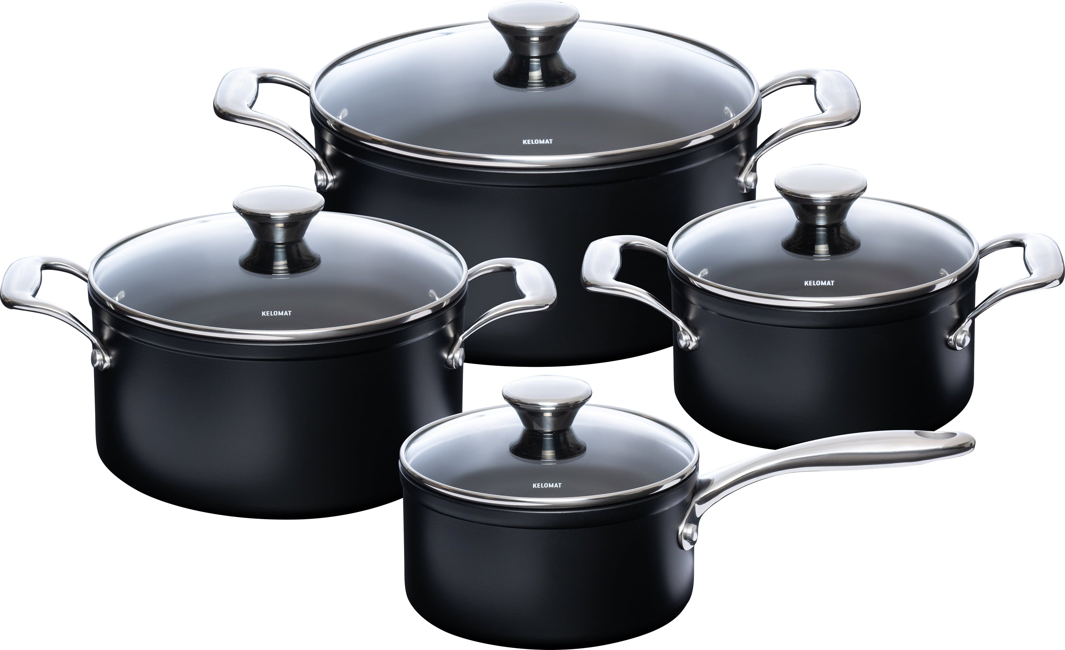 Osmidílná sada nádobí NUOVO od KELOmat Vám nabídne promyšlený výběr hrnců včetně odpovídajících skleněných poklic. Kvalitní zpracování zajišťuje rovnoměrné rozložení tepla a dělá ze sady odolného a spolehlivého pomocníka pro každodenní vaření. Díky kompatibilitě se všemi běžnými typy sporáků včetně indukce je nádobí maximálně flexibilní pro každou kuchyni.