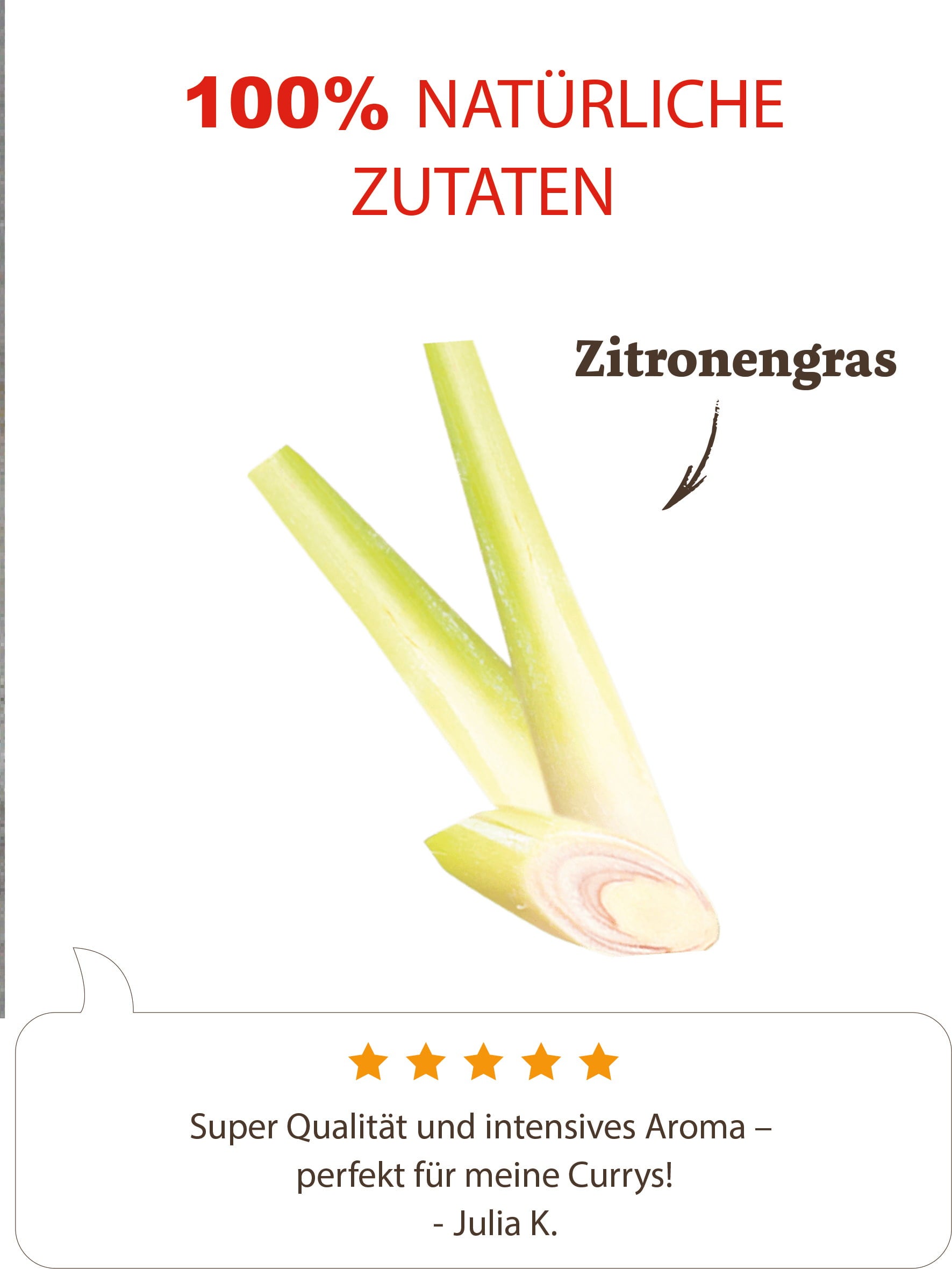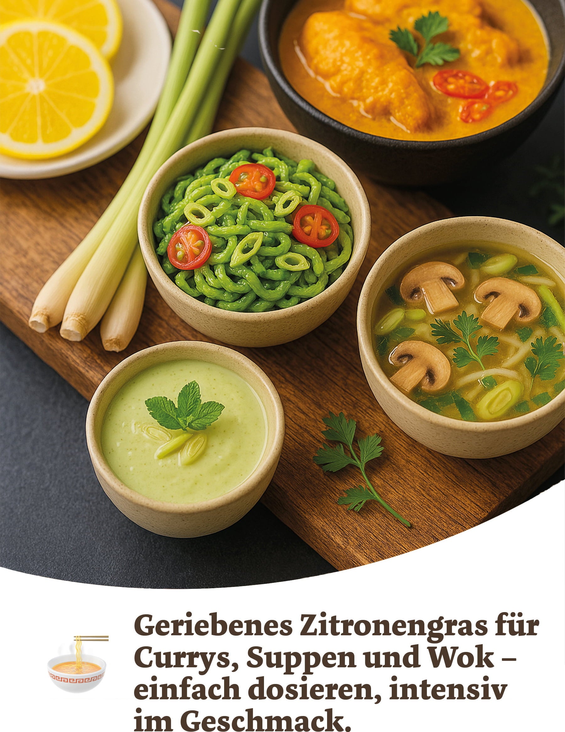 Osvěžující citronová tráva, díky své citronové a lehce štiplavé chuti, dokonale doplní Váš pokrm. Citronová tráva je vynikající do kari, salátů, dezertů a polévek.