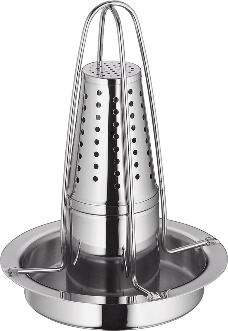 Postup je jednoduchý: Kuře posaďte na stojan a pečte při 180 °C (alternativně do dosažení vnitřní teploty 80-85 °C). Vytékající tuk se zachytí v praktické nádobě.