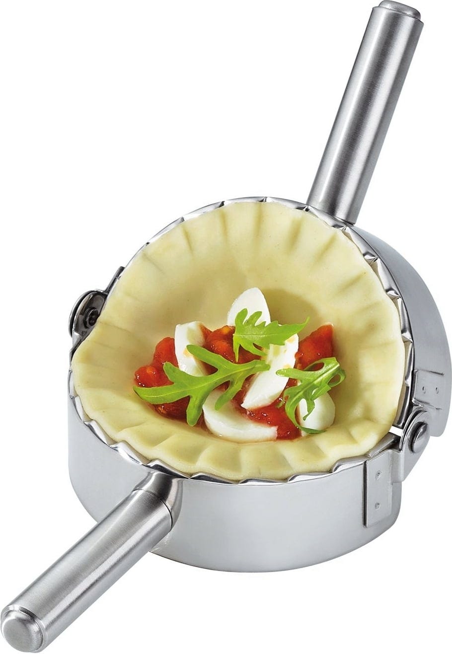 Obzvlášť praktické řešení: vnější stranu použijete k vykrojení těsta, vnitřní část slouží k jeho uzavření. Stačí vložit stejně velké kousky těsta s náplní dovnitř formy, obě poloviny stisknout k sobě a hotové taštičky rovnou vložit do horké vody. Pak už jen servírovat a vychutnat si je.
