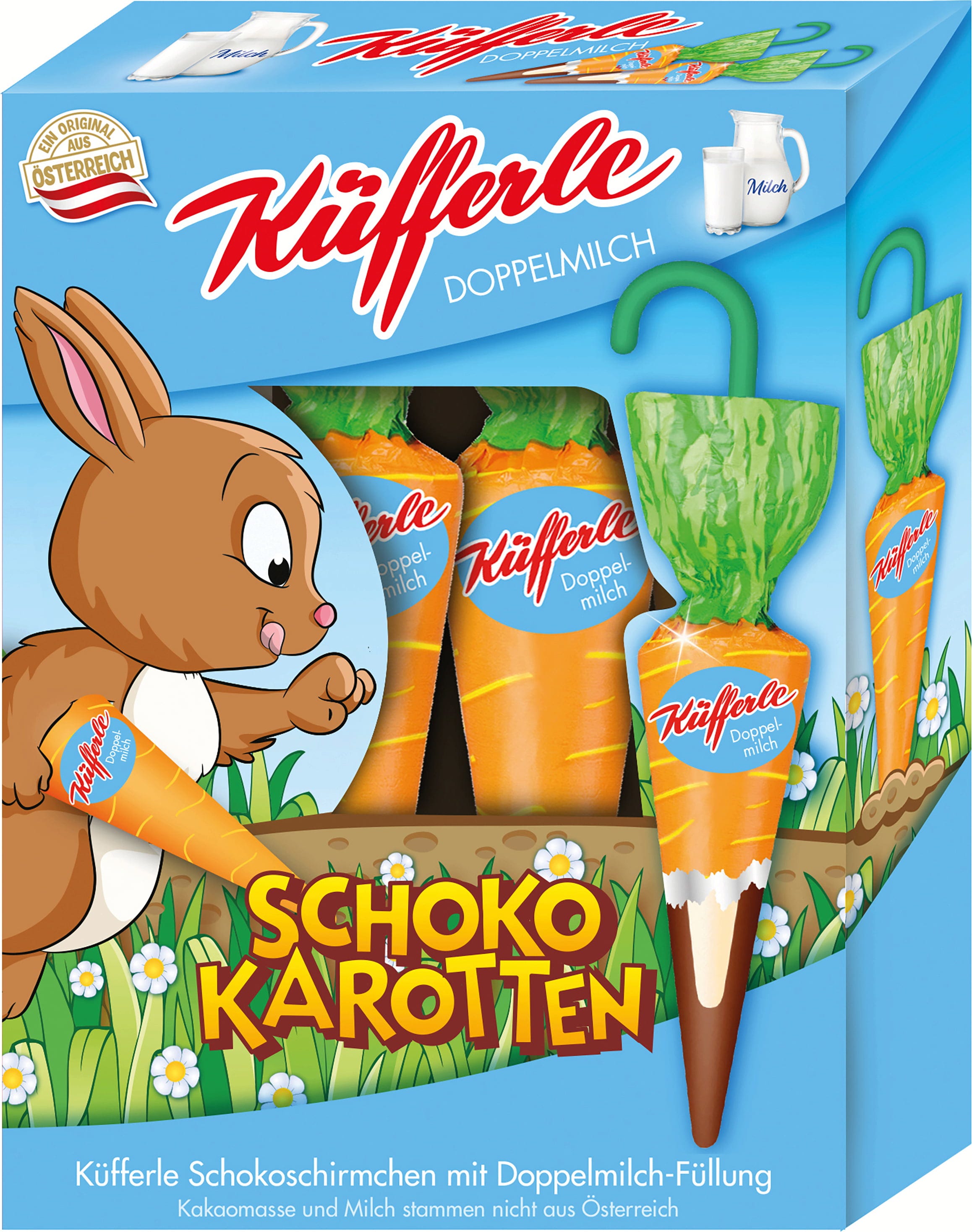 Milujete něco extra? Pak jsou čokoládové mrkvičky Küfferle přesně pro Vás. Pod obalem z klasické mléčné čokolády se ukrývá jemná dvojitě mléčná náplň, která zajišťuje obzvlášť krémový chuťový zážitek. Tyto sladká lákadla se skvěle hodí do velikonočních košíků, kde se stanou opravdovým sladkým zpestřením!