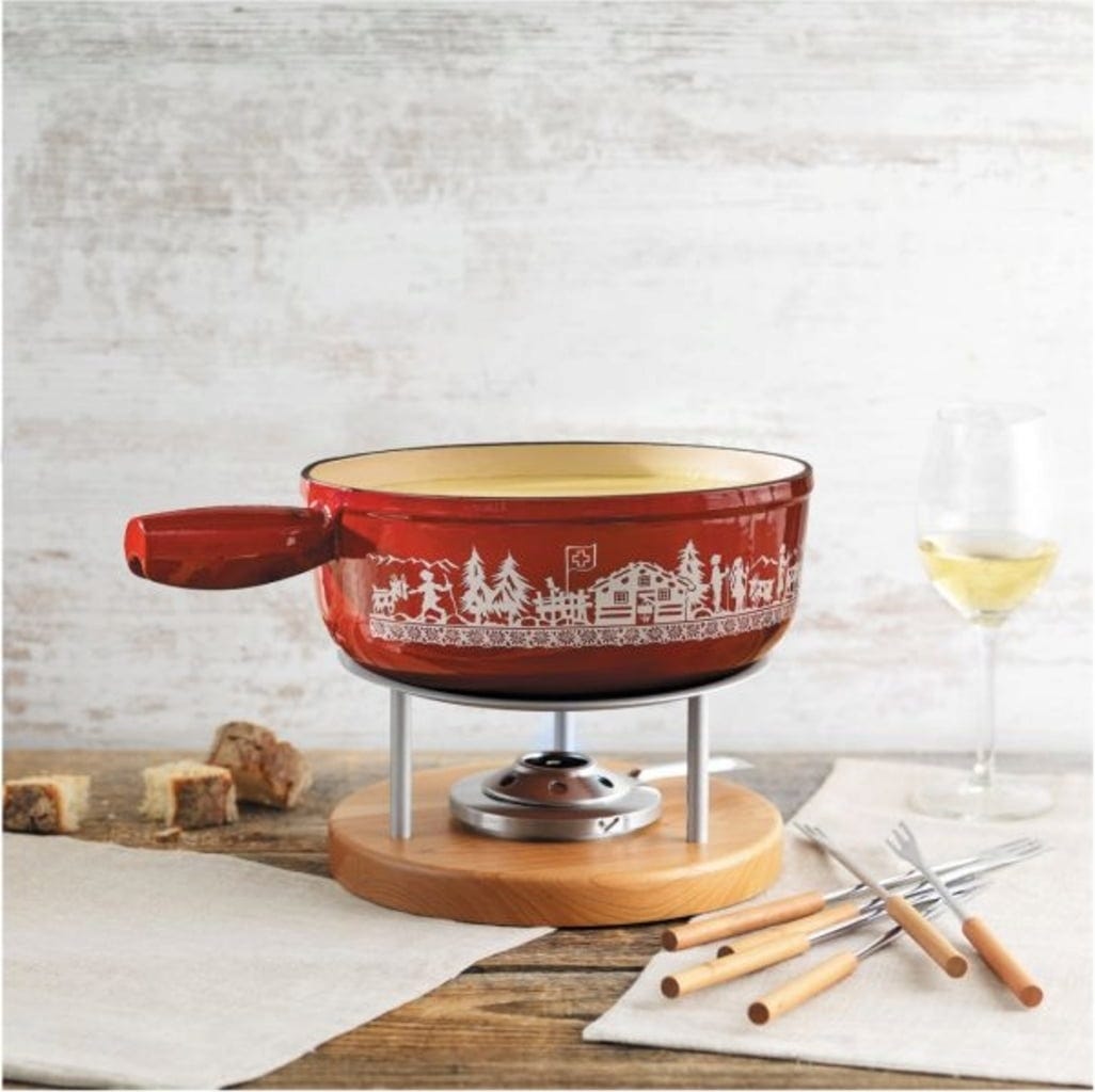 Klasický švýcarský šarm by na fondue večeru rozhodně neměl chybět. Litinový caquelon s červenou glazurou a bílým potiskem ve stylu tradičního švýcarského vystřihovaného ornamentu vytváří dokonalou atmosféru. Zároveň vyniká ideální tepelnou vodivostí i schopností akumulace tepla. Skutečný hit.