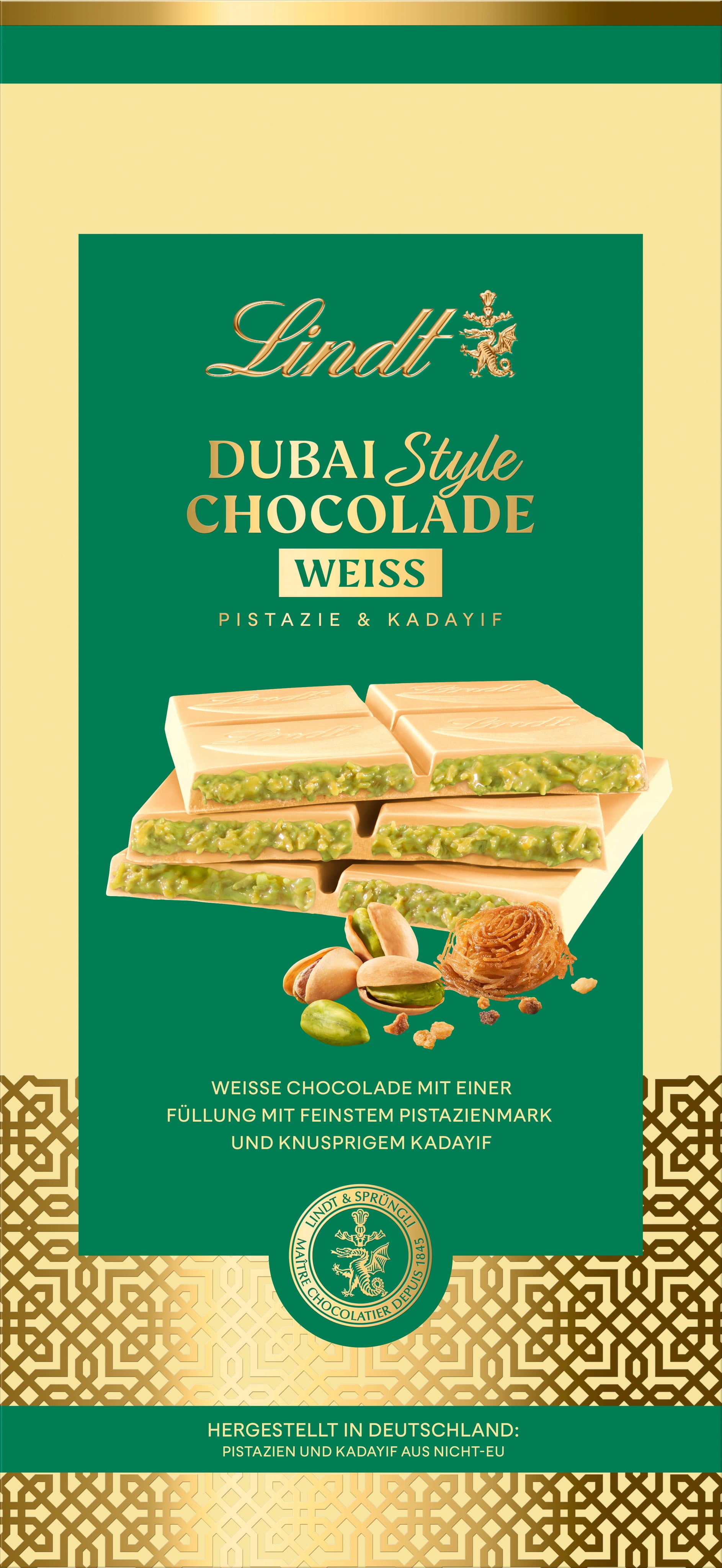 Tato bílá čokoláda Lindt je plněná pistáciovým krémem a kadayif nitkami. Vysoký podíl pistácií jí dodává výrazně oříškovou chuť.