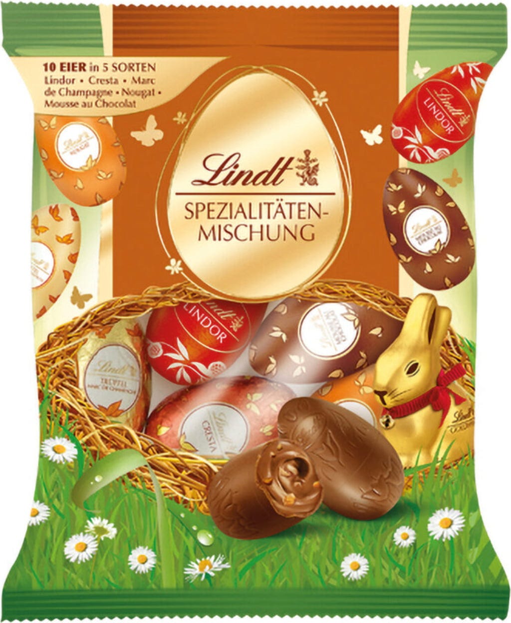 Speciální směs Lindt obsahuje 10 čokoládových vajíček v 5 klasických druzích Lindt: Lindor, Cresta, Marc de Champagne (alkoholické), Nougat a Mousse au Chocolat. Ideální jako dárek.
