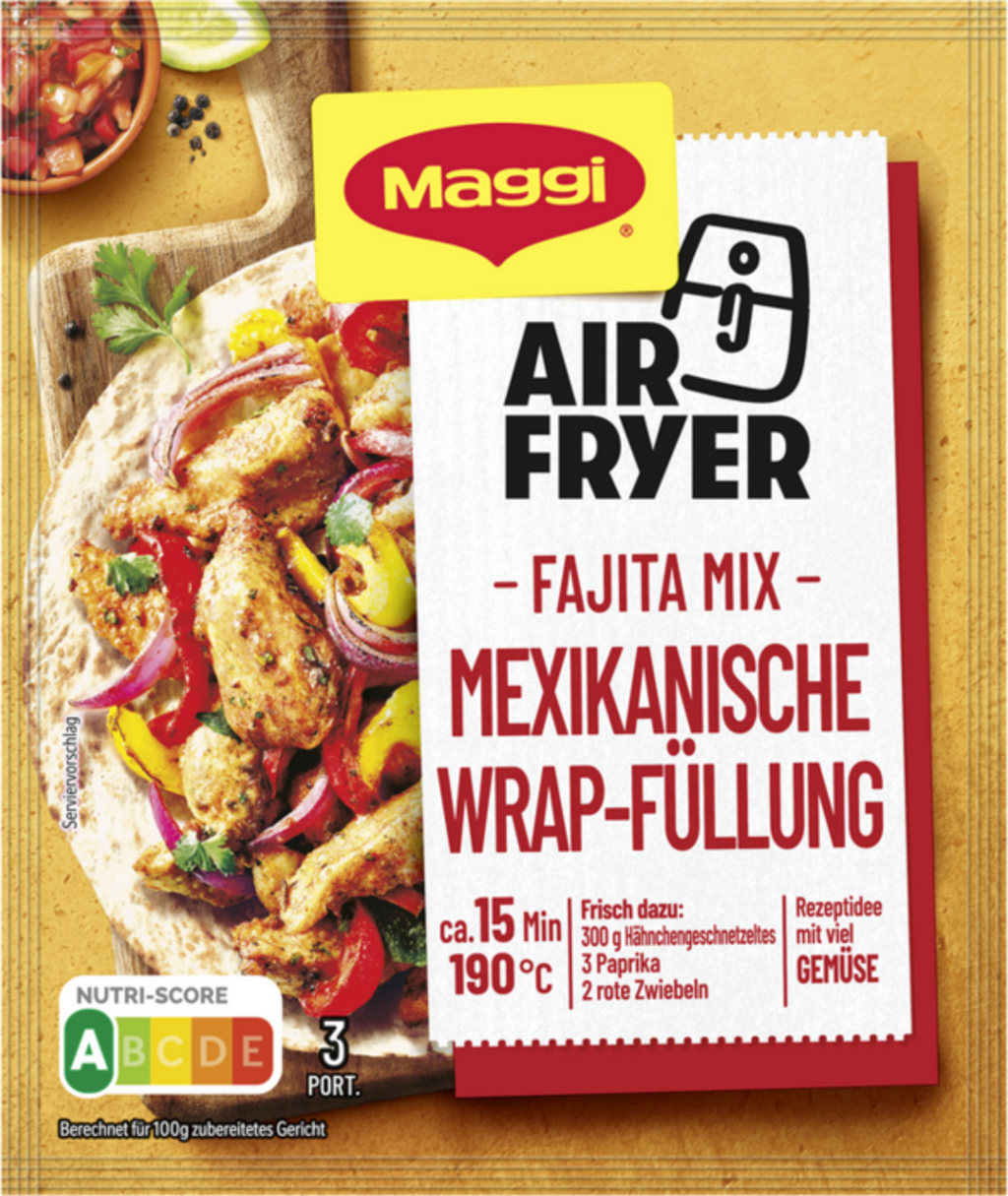 S kořenicí směsí Air Fryer od značky Maggi si doma snadno připravíte šťavnaté, výrazně kořeněné fajitas jako z pravé tex-mex kuchyně. Směs vyvinutá speciálně pro horkovzdušnou fritézu zajišťuje intenzivní chuť a křupavou strukturu, a to zcela bez přidaného tuku. Ať už zvolíte kuře, zeleninu nebo náplň do tortill, Vaše pokrmy budou hotové během chvilky a ideální ke sdílení.