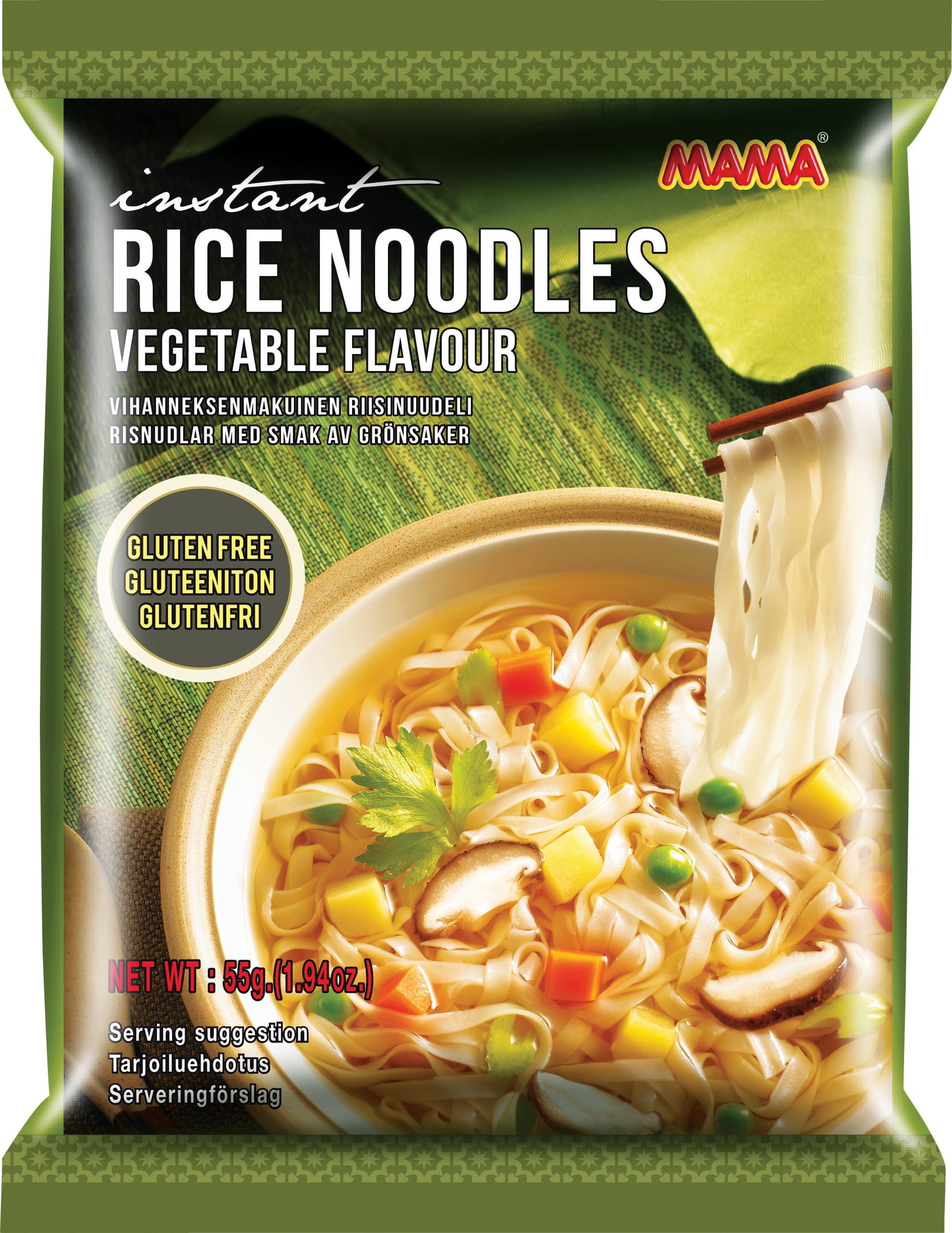 Vychutnejte si tyto instantní rýžové nudle s lehkým zeleninovým vývarem od značky MAMA - jednoduché potěšení, které Vám rychle poskytne chutné jídlo. Bezlepková varianta je založená na rýžové mouce a zeleninovém aroma. Ideální pro všechny, kteří se chtějí vyhnout lepku.