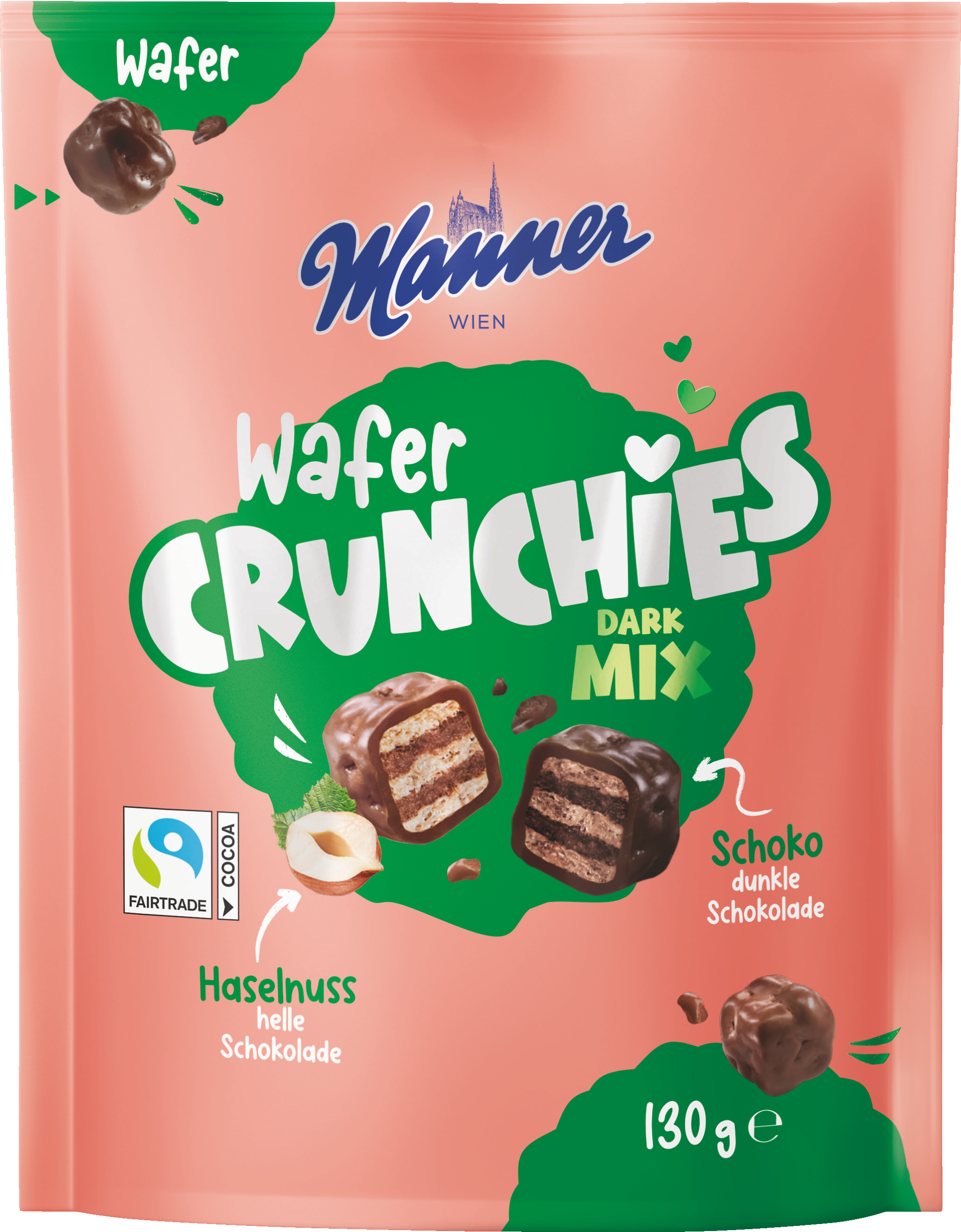 Manner Wafer Crunchies Dark Mix jsou ideální svačinkou pro každou příležitost. Směs křupavých lísko-oříškových oplatkových kostiček v jemné mléčné čokoládě a delikátních oplatek v polevě z hořké čokolády přináší nevšední chuťový zážitek. Perfektní na cesty, doma k seriálu i do kanceláře.