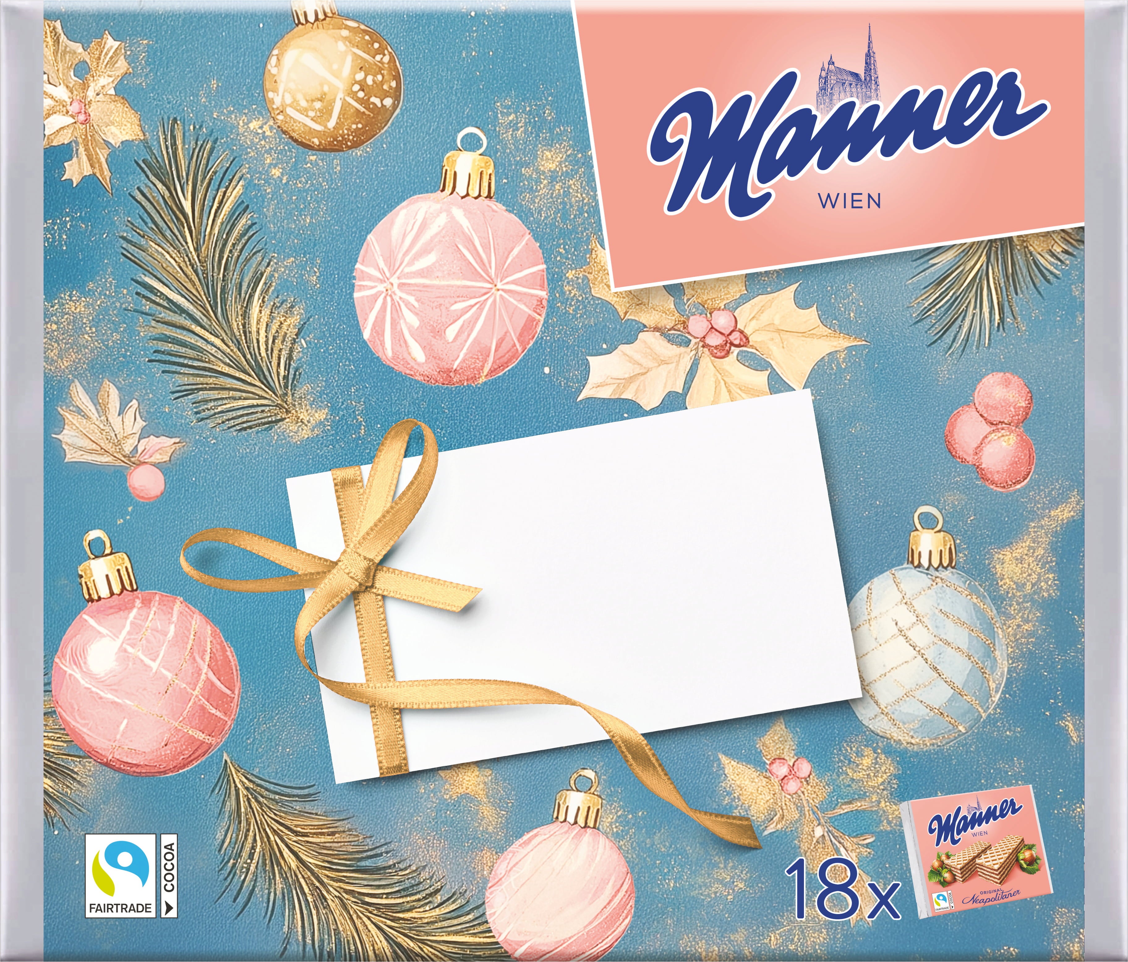 Ve velkém balení Manner najdete hned 18 balení oblíbených Manner Original Neapolitaner oplatek. Díky roztomilým vánočním motivům je toto maxi balení ideální jako dárek.