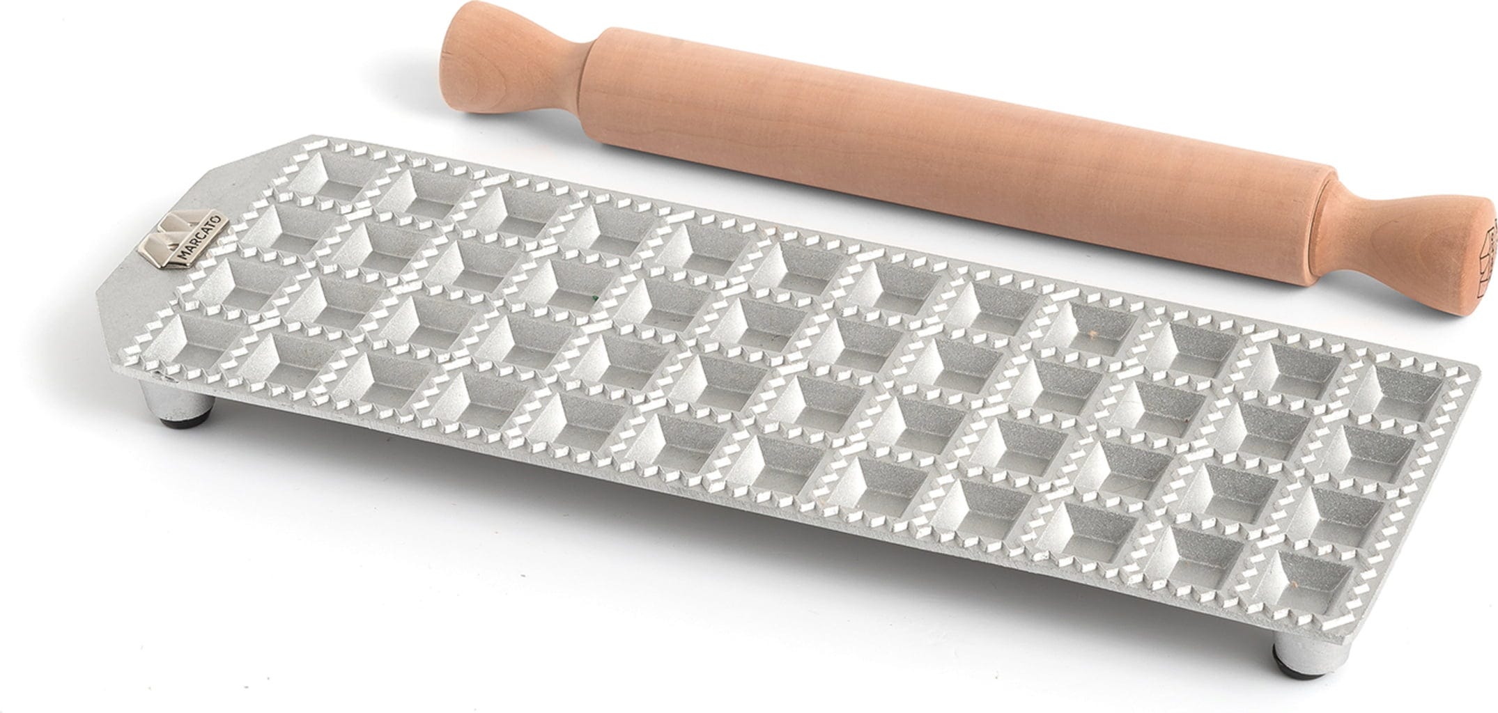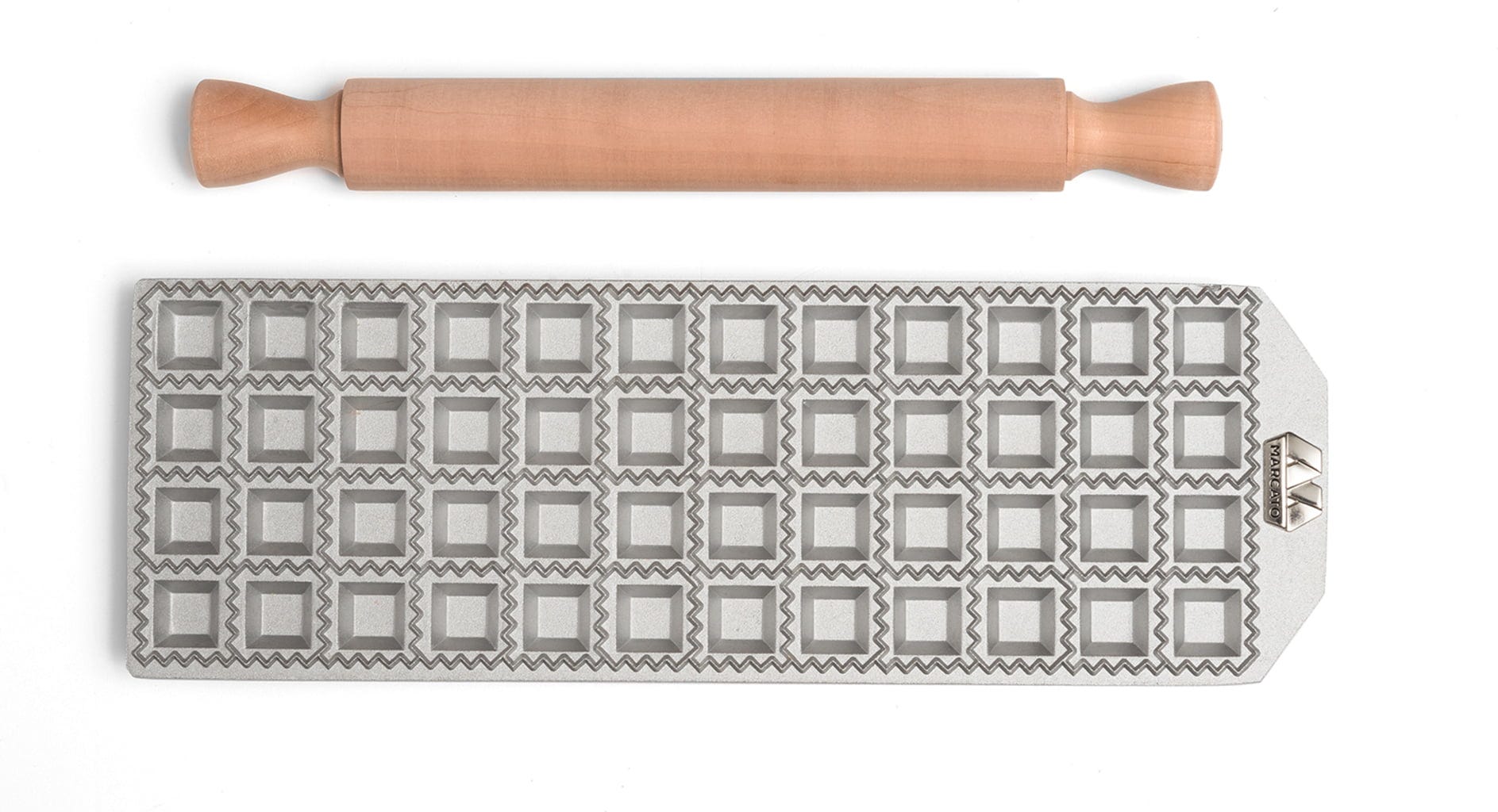 Nádherná forma na ravioli je k dispozici v různých velikostech a dodává se s ní také váleček z masivního dřeva s přírodním voskovým povrchem a laserovým gravírováním. Váleček má také ergonomický tvar, díky kterému je rukojeť stabilní a snadno se používá.