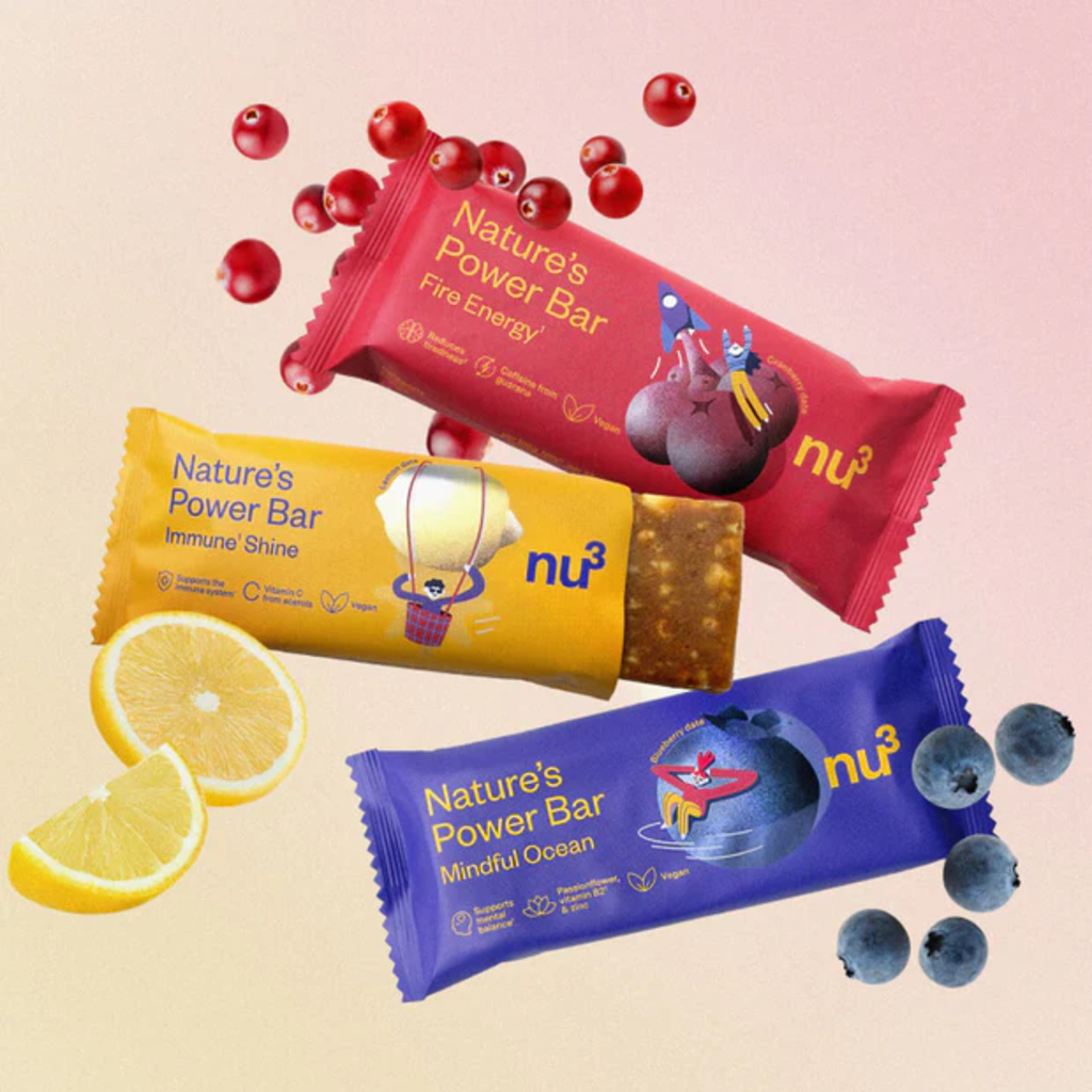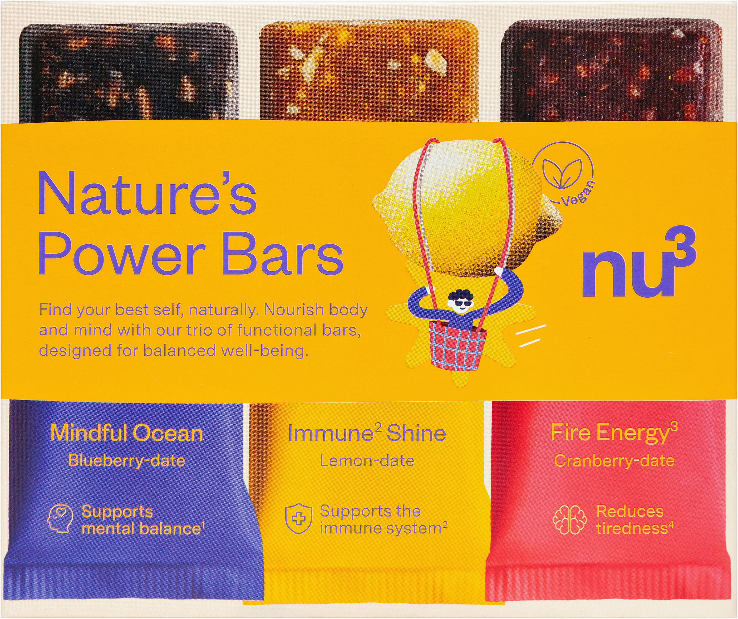 Projděte dnem s chutí a vědomě – s tyčinkami nu3 Nature’s Power Bars. Tyto rostlinné snacky jsou založeny na datlích, kešu oříšcích a funkčních rostlinných bílkovinách. Vyberte si mezi variantami Power¹, Immun-Support³ nebo Balance⁴ a užijte si pestré ovocné tyčinky bez sladidel a umělých aromat.