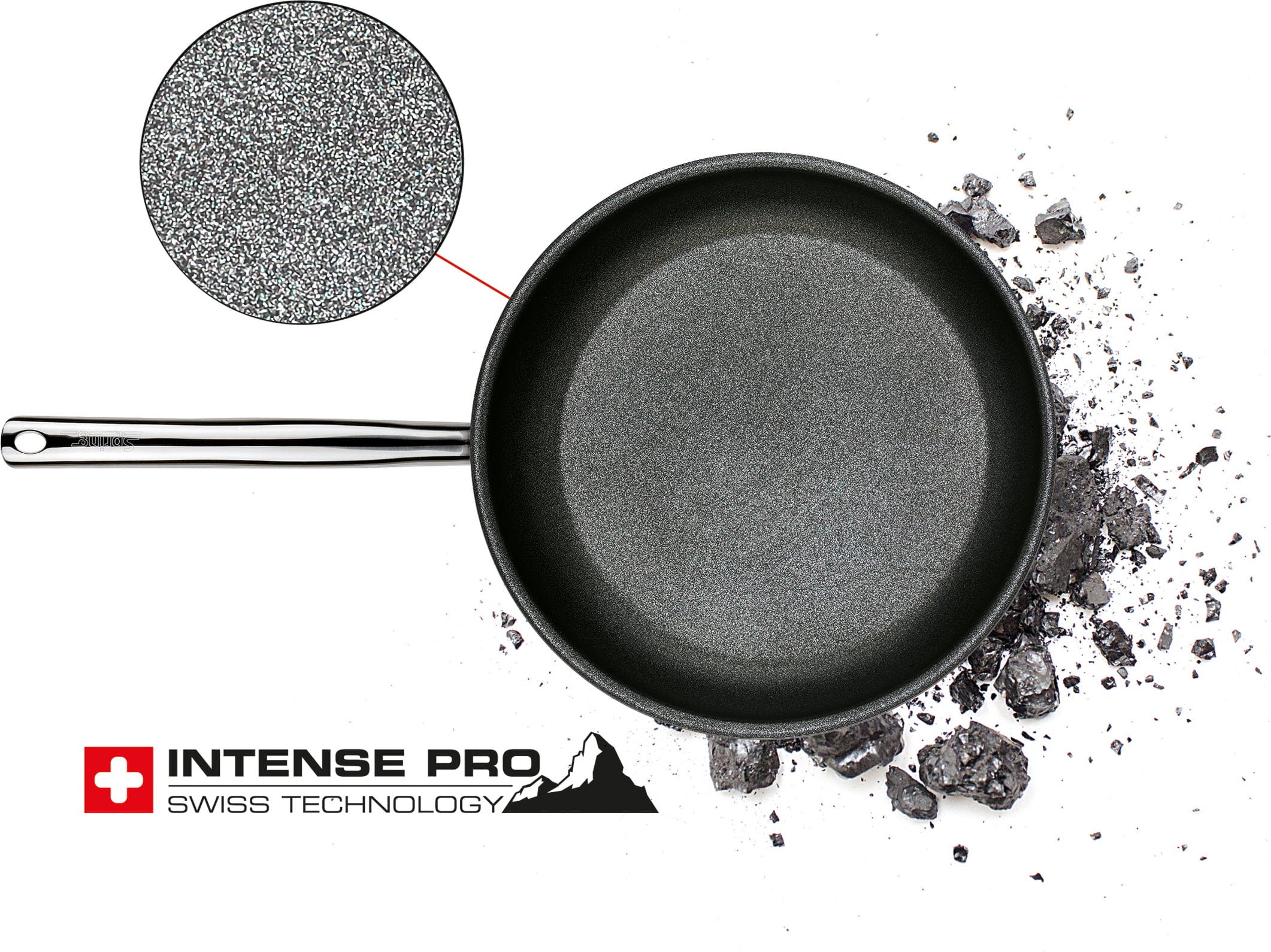 S pánví Vulcano Intense Pro od značky Spring vstoupí do Vaší kuchyně skutečná profesionální úroveň! Díky inovativnímu 5-vrstvému vícevrstvému materiálu s trojitým hliníkovým jádrem se teplo rozvádí naprosto rovnoměrně a bleskově až do vysokého okraje, což Vám dává plnou kontrolu nad smažením. Vnitřní povrchová úprava je vyztužena pravými švýcarskými horskými krystaly, díky čemuž je extrémně odolná – můžete tak bez obav používat i kovové obracečky, aniž byste poškodili povrch.