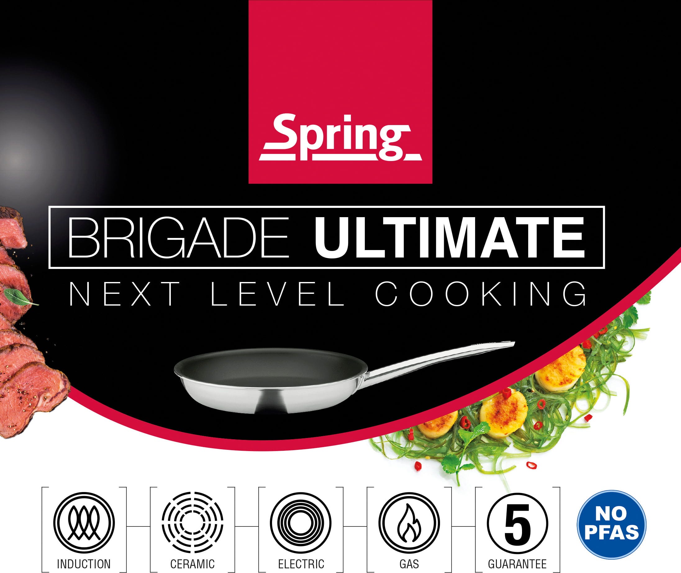 Se servírovací pánví Brigade Ultimate od značky Spring pozvednete Své kuchařské umění na zcela novou úroveň! Tajemství jejího vynikajícího výkonu spočívá v osvědčeném pětivrstvém materiálu: trojité hliníkové jádro zajišťuje bleskurychlé a naprosto rovnoměrné rozložení tepla, zatímco robustní nerezový povrch přesvědčí přirozeným nepřilnavým efektem.