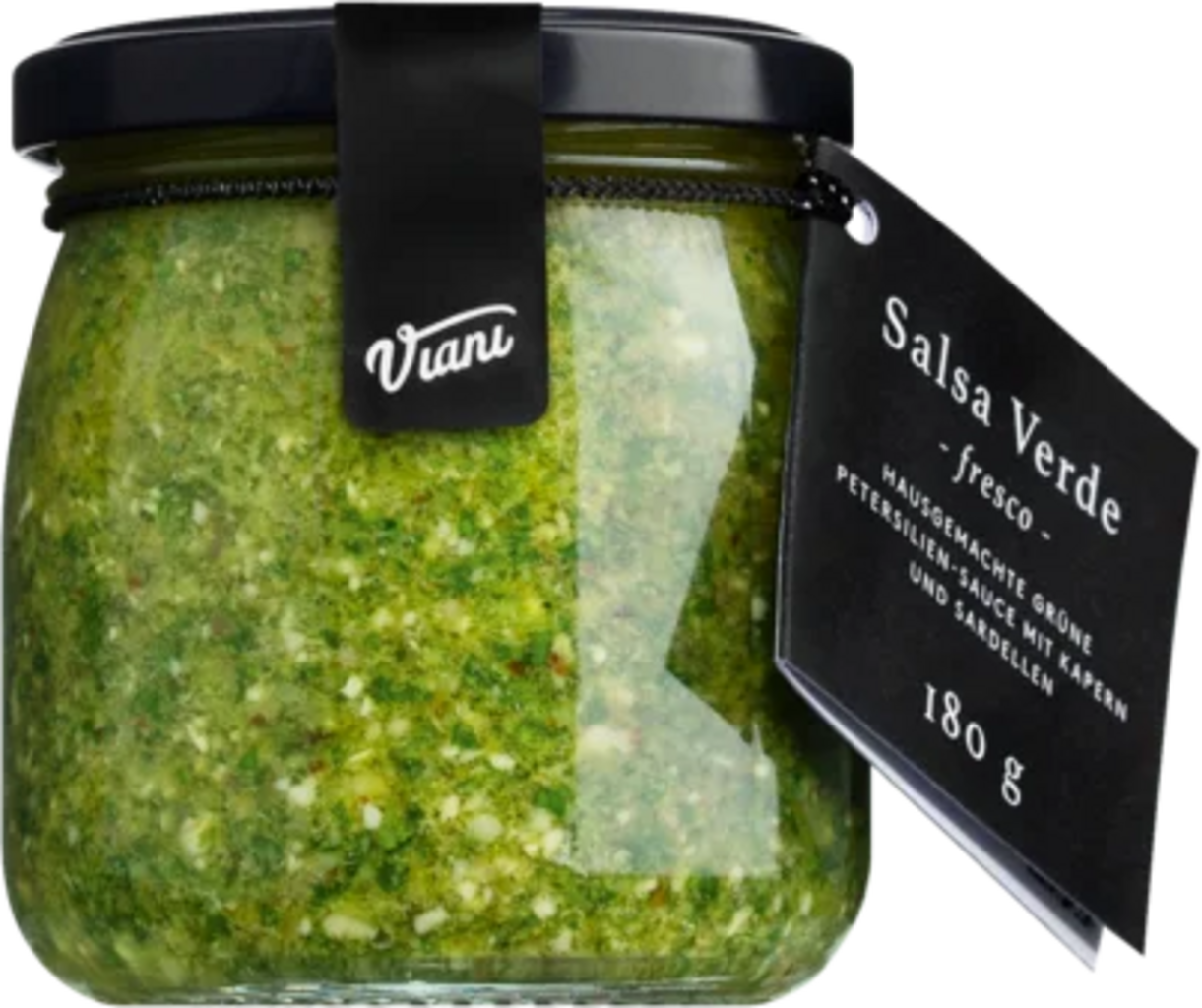 Objevte s touto svěží Salsa Verde autentické chutě italské kuchyně přímo u Vás doma. Jemná kompozice z výrazné petrželky, slaných kaparů a aromatických sardelí je harmonicky doplněna kvalitním extra panenským olivovým olejem a dotekem citronu a česneku. Mandle a piniové oříšky dodávají omáčce příjemnou hloubku a zajímavou texturu. Tato studená omáčka je všestranným společníkem: skvěle chutná ke grilovaným či pečeným rybám, výborně se hodí k vařenému masu a pečenému kuřeti a vytříbeně doplní také brambory nebo vejce.