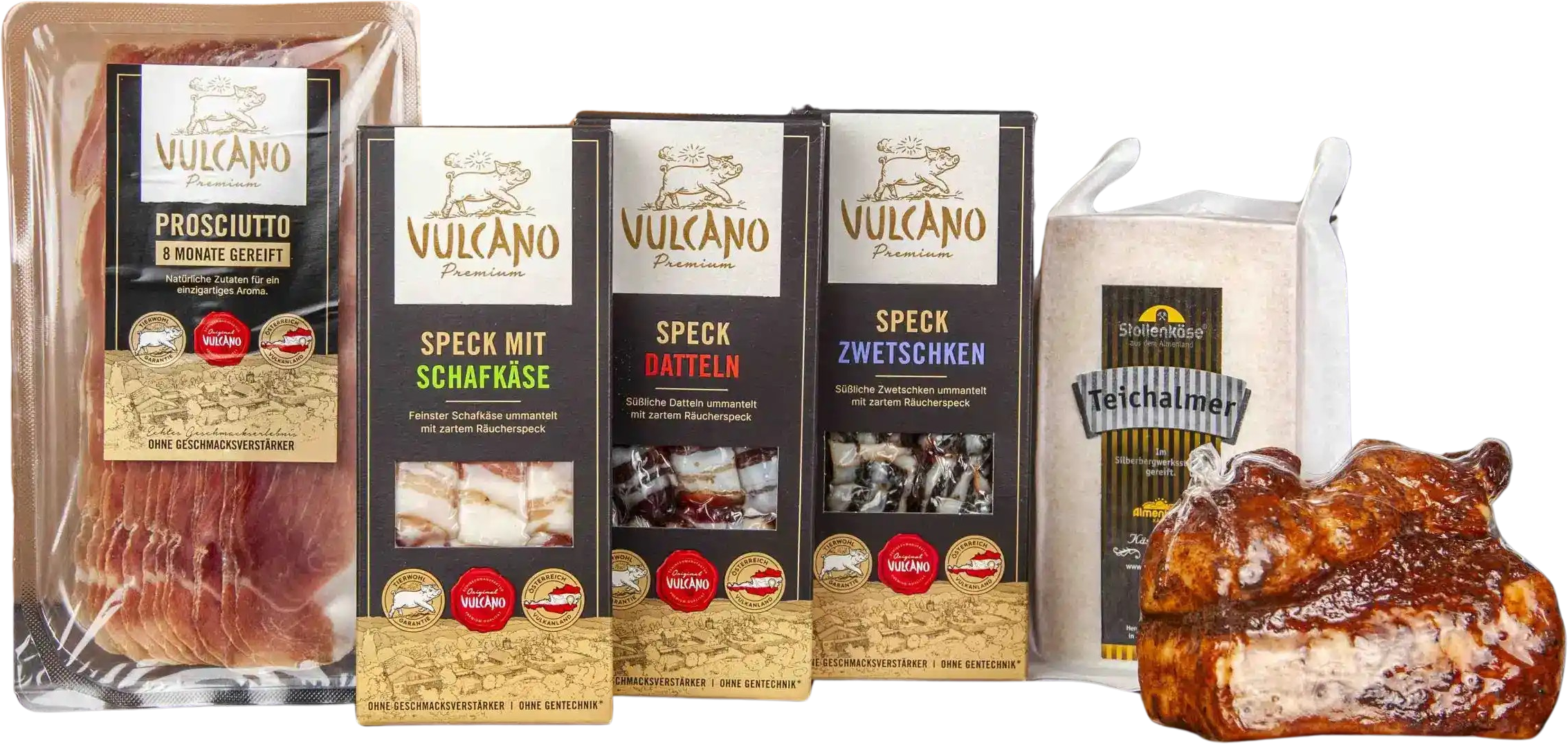 Se sadou Vulcano Raclette proměníte každý raclette večer v skutečný zážitek! Ať už na zimní pohodu nebo výjimečné příležitosti – tento set spojuje vybrané speciality z dílny Vulcano, které spolu dokonale ladí a posunou Váš raclette zážitek na novou úroveň. Od výrazného ovčího sýra ve slaninovém plášti, přes kořeněné datle ve slanině, až po jemně se rozplývající sýr – na své si přijde každý gurmán.
