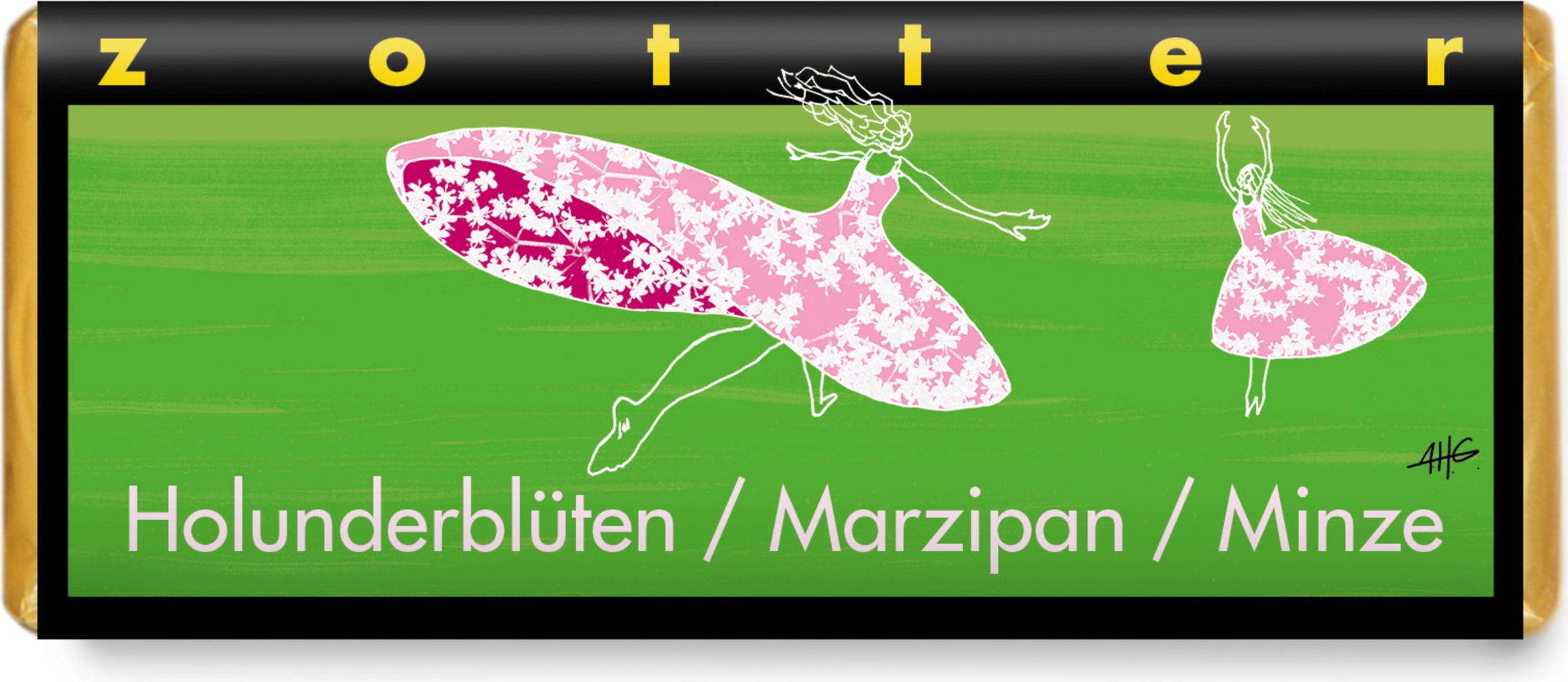 Spojuje dvě náplně – květinovou svěží vrstvu z bezinkového sirupu vlastní výroby s bílou čokoládou, citronovou couverture a čerstvou mátou a druhou vrstvu tvoří měkký vinný marcipán, který je, díky špetce bílého vína Zotter a pálenky, příjemně „lehoučce šmrnclý.“