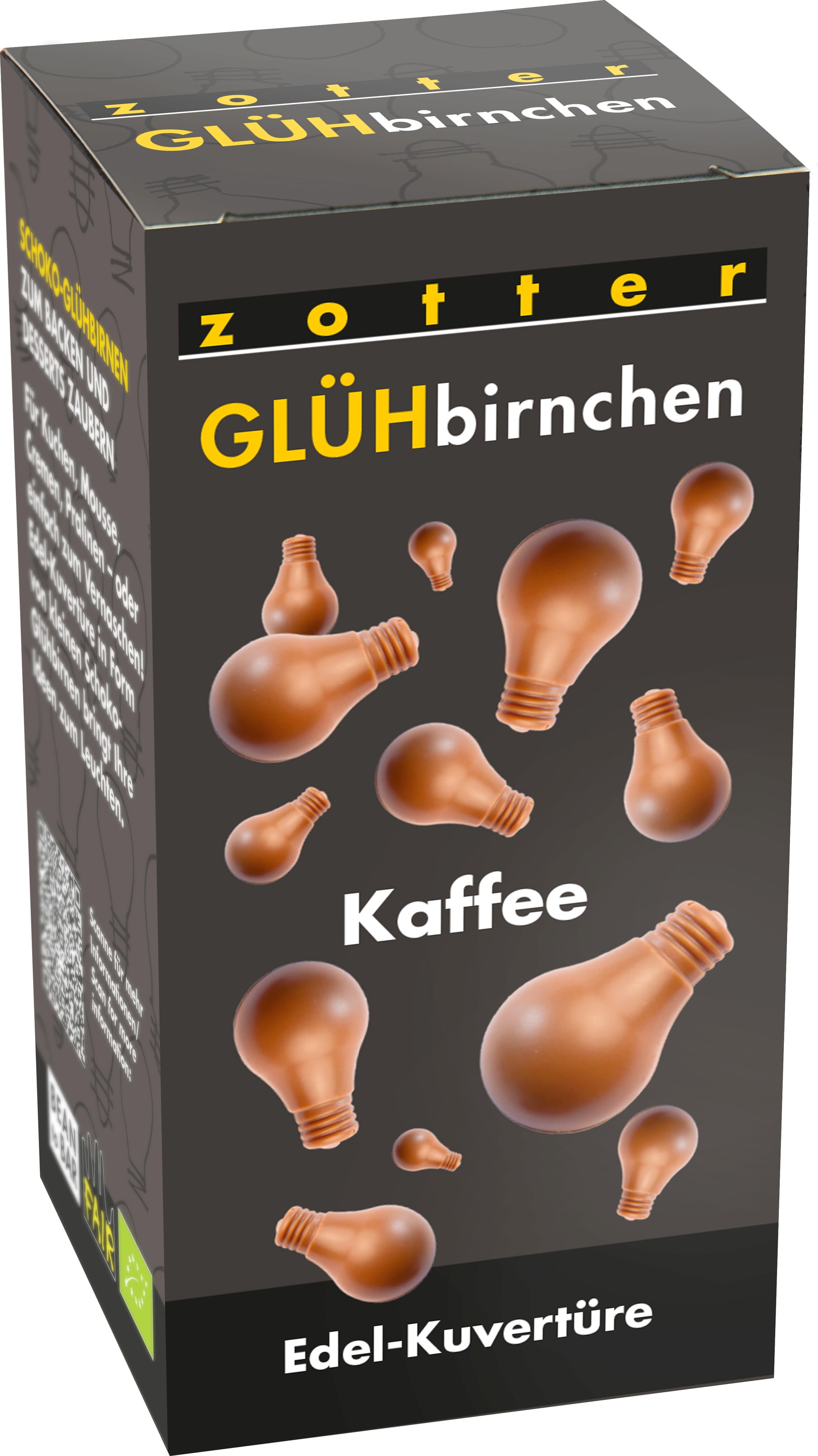 Vneste do svých čokoládových kreací závan čerstvosti, díky žárovkám značky Zotter. Půlky žárovek jsou vyrobeny z FairTradé kávy z vlastní pražírny firmy Zotter, pravého kakaového másla, které se báječně rozpouští, a třtinového cukru. Součástí je také mléko od tyrolských ekologických horských zemědělců.