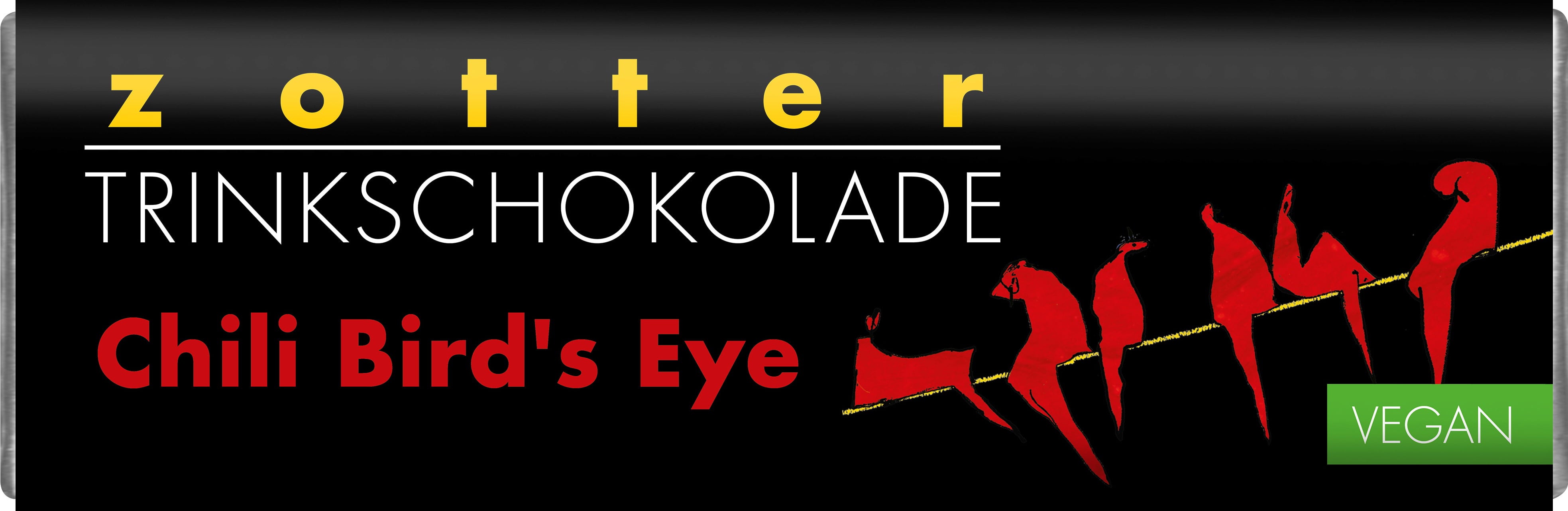 Pěkně vysoký obsah chilli v jedné čokoládě! Druh "Bird's Eye" je považován za původní formu chilli a je vzácný, ohnivý a plný chuti. Tato vysokoprocentní hořká čokoláda na pití se vyrábí přímo ve firmě z čokoládových bobů a rozlévá se do tabulek. Kořeněný nápoj, který povzbuzuje smysly.
